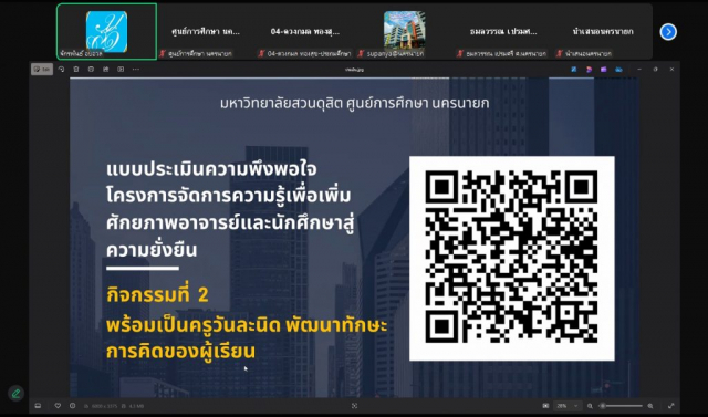 มหาวิทยาลัยสวนดุสิต ศูนย์การศึกษา นครนายก จัดอบรมโครงการจัดการความรู้เพื่อเพิ่มศักยภาพอาจารย์ และนักศึกษาสู่ความยั่งยืน กิจกรรมที่ 2 พร้อมเป็นครูวันละนิด พัฒนาทักษะการคิดของผู้เรียน โดยได้รับเกียรติจาก รองศาสตราจารย์ ดร.มารุต พัฒผล (UKPSF ระดับ Senior Fellow) ผู้อำนวยการศูนย์ผู้นำนวัตกรรมหลักสูตรและการเรียนรู้ บัณฑิตวิทยาลัย มหาวิทยาลัยศรีนครินทรวิโรฒ และอาจารย์ ดร.วิษณุ นภาพันธ์ (อาจารย์ดีเด่นด้านการสอน) ประธานหลักสูตรการศึกษาบัณฑิต สาขาวิชาคณิตศาสตร์ คณะศึกษาศาสตร์ มหาวิทยาลัยทักษิณ วิทยาเขตพัทลุง เป็นวิทยากรผู้ให้ความรู้ โดยมีอาจารย์หลักสูตรศึกษาศาสตรบัณฑิต สาขาวิชาการศึกษาปฐมวัย และสาขาวิชาการประถมศึกษา และบุคลากรทางการศึกษาเข้าร่วมการอบรม ในวันที่ 27 มีนาคม 2568 เวลา 09.00 – 12.00 น. ผ่านระบบออนไลน์ ZOOM