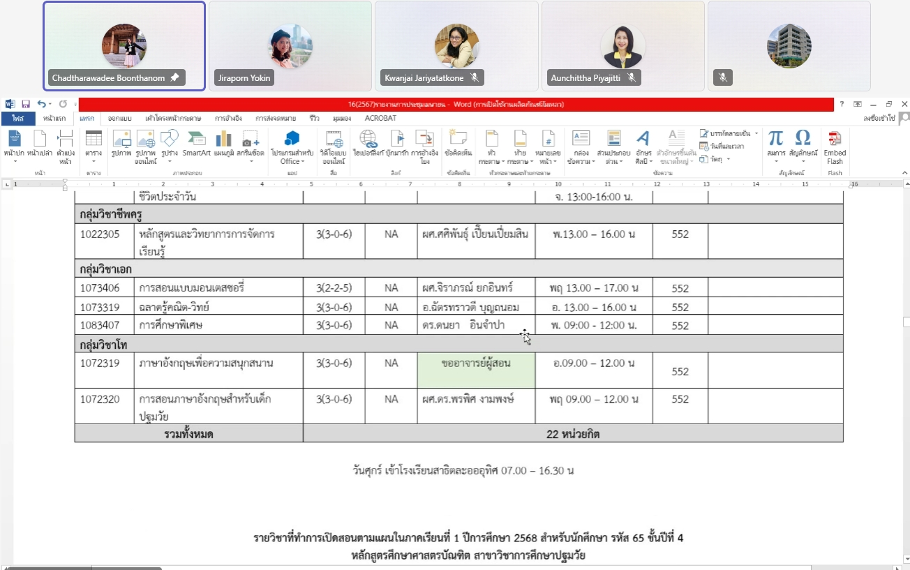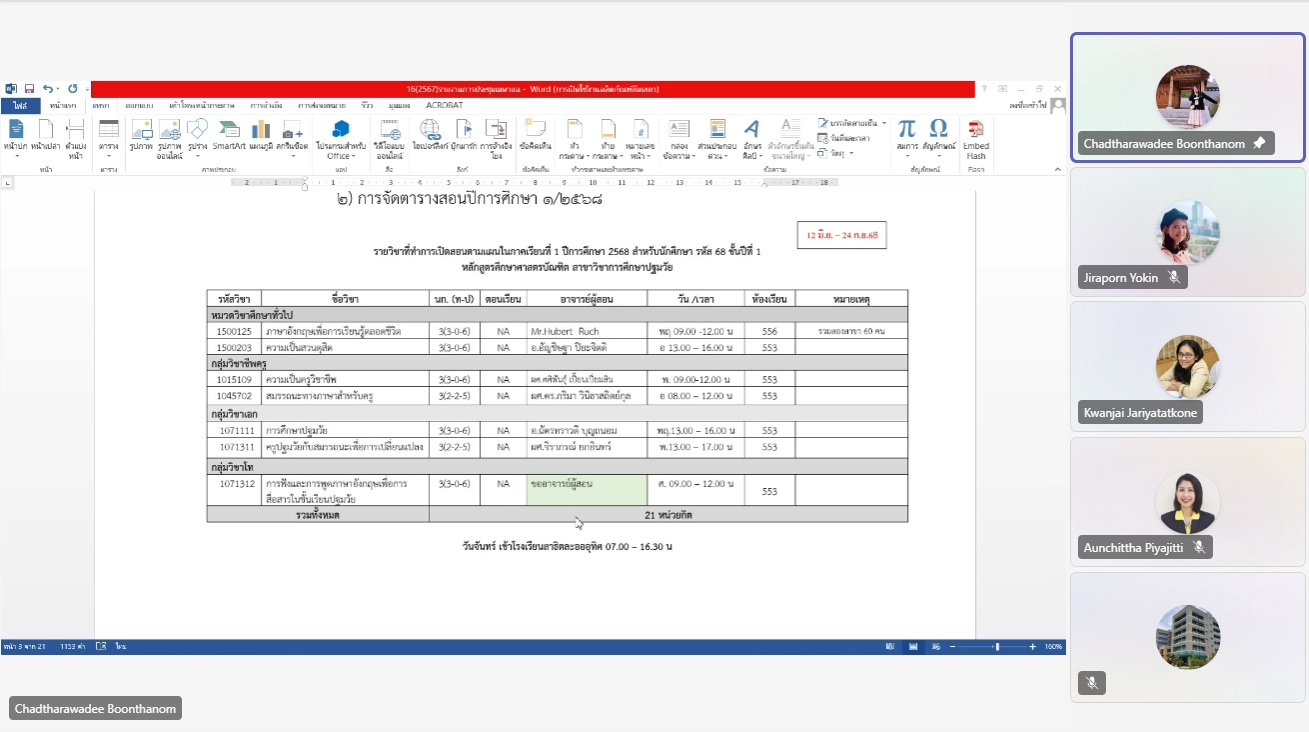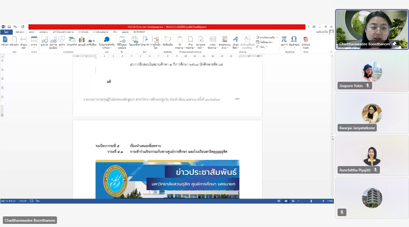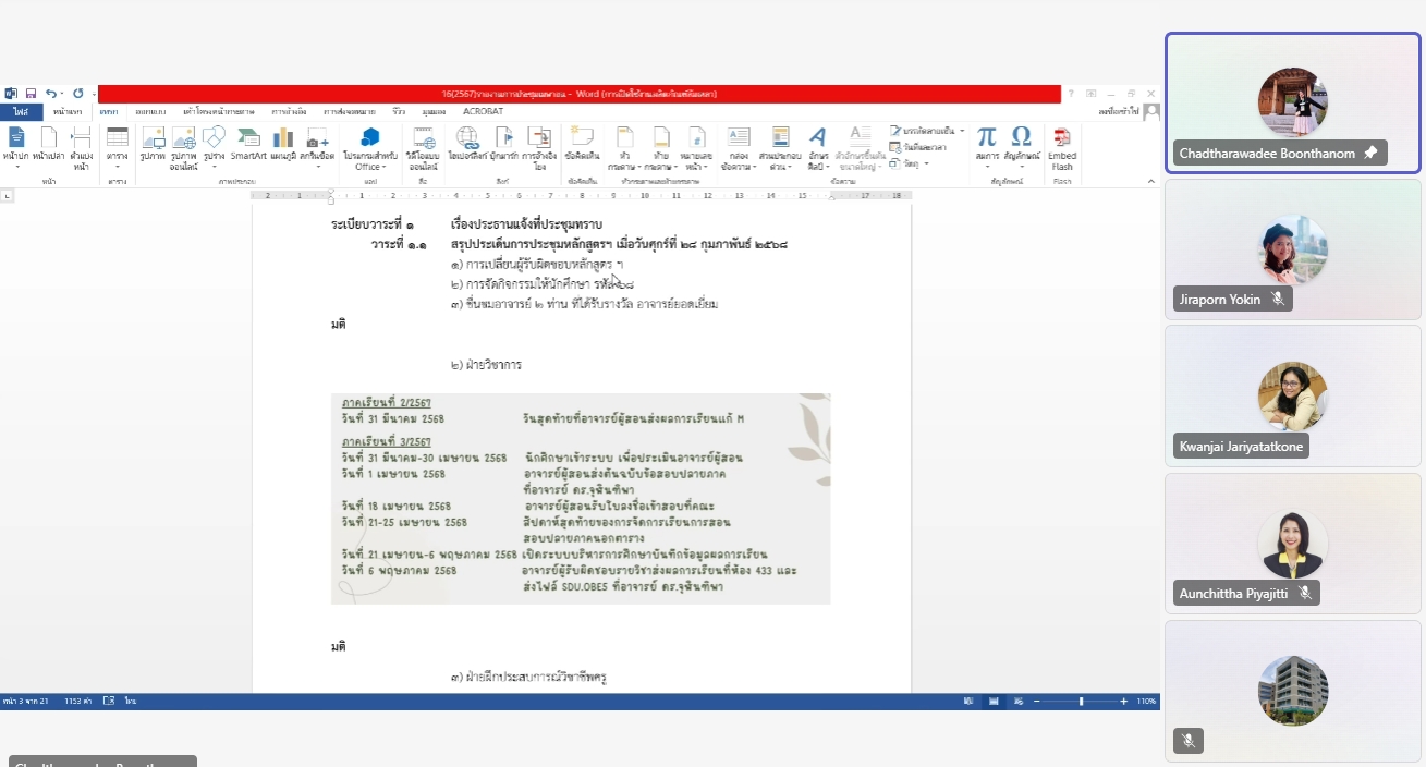 มหาวิทยาลัยสวนดุสิต ศูนย์การศึกษา นครนายก นำโดย นางสาวฉัตรทราวดี บุญถนอม พร้อมคณะคณาจารย์หลักสูตรศึกษาศาสตรบัณฑิต สาขาวิชาการศึกษาปฐมวัย จัดประชุมหลักสูตรศึกษาศาสตรบัณฑิต สาขาวิชาการศึกษาปฐมวัย ประจำเดือนเมษายน 2568 เพื่อติดตามผลการดำเนินงานของหลักสูตรศึกษาศาสตรบัณฑิต สาขาวิชาการศึกษาปฐมวัย ในวันที่ 4 เมษายน 2568 เวลา 11.00 – 12.00 น. ผ่านระบบ online microsoft team