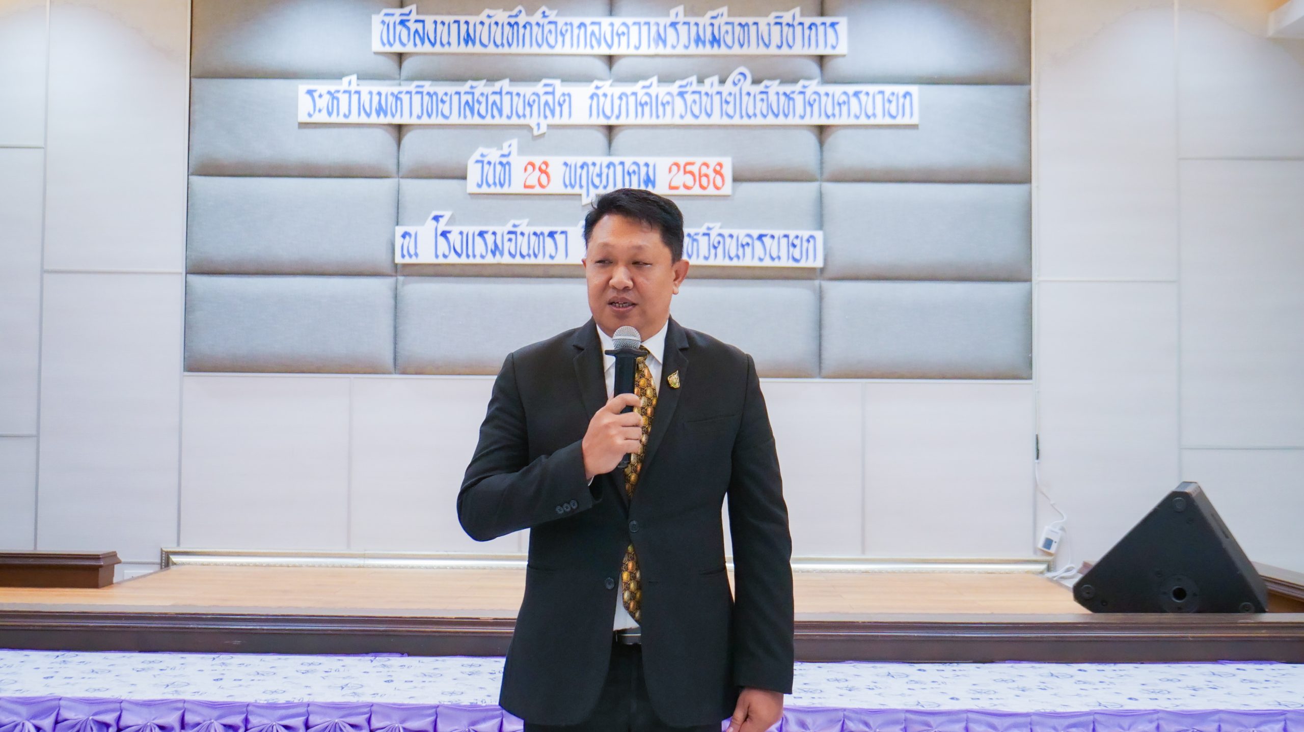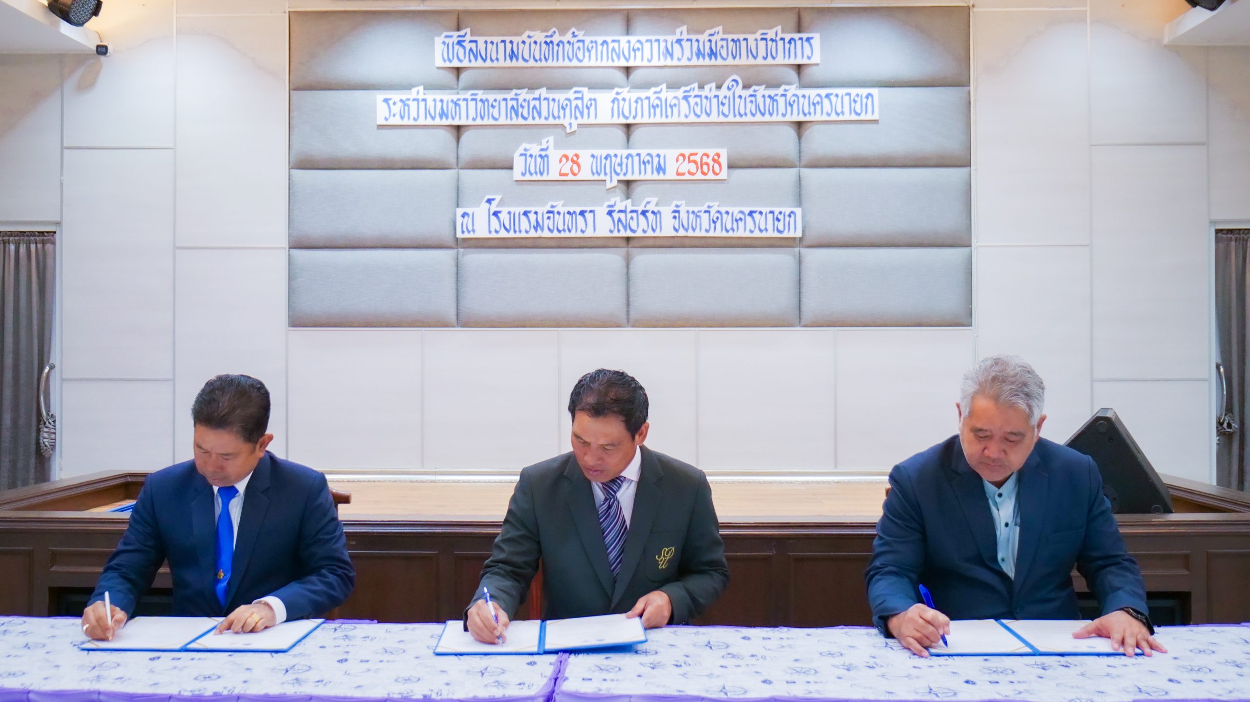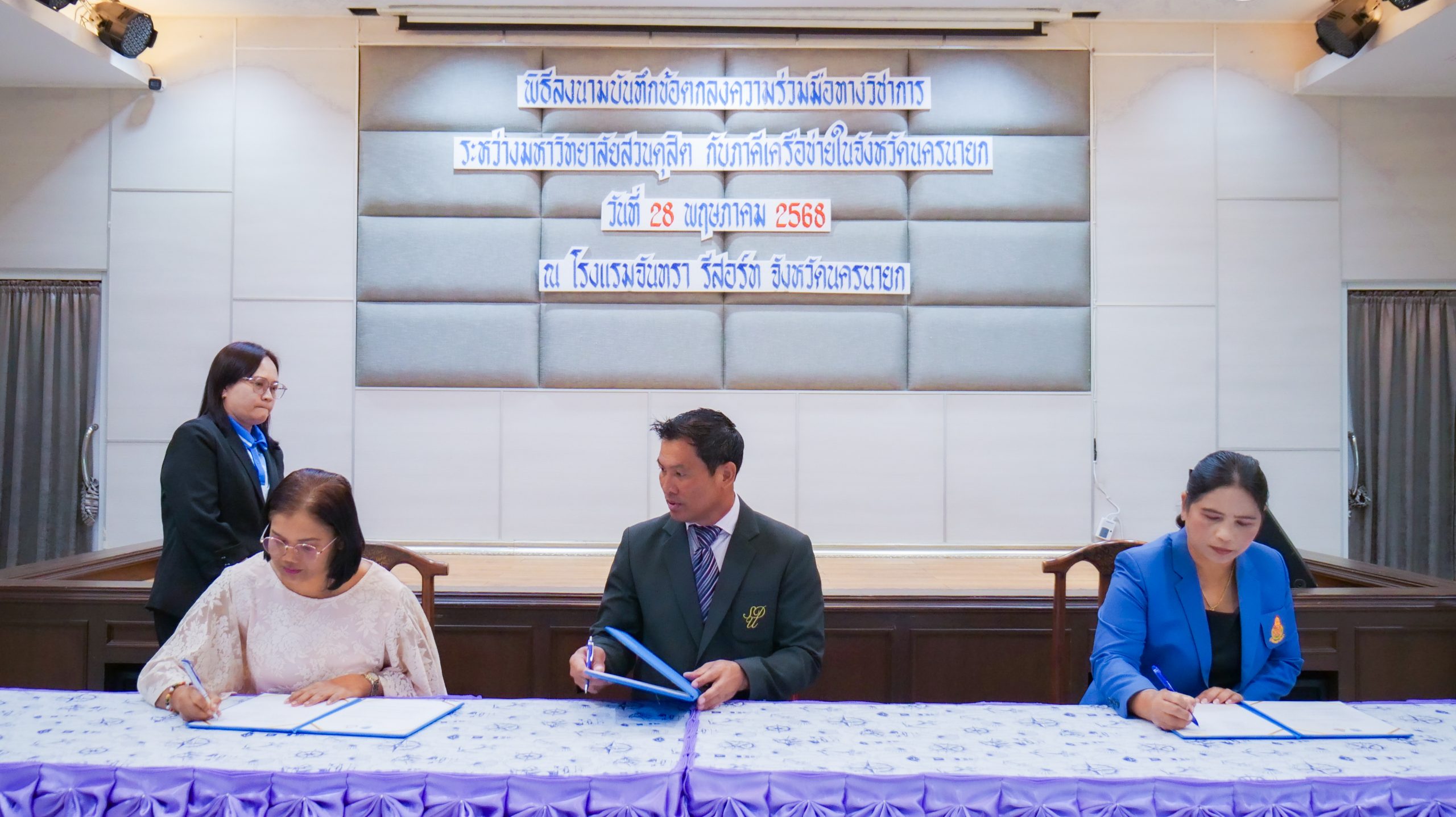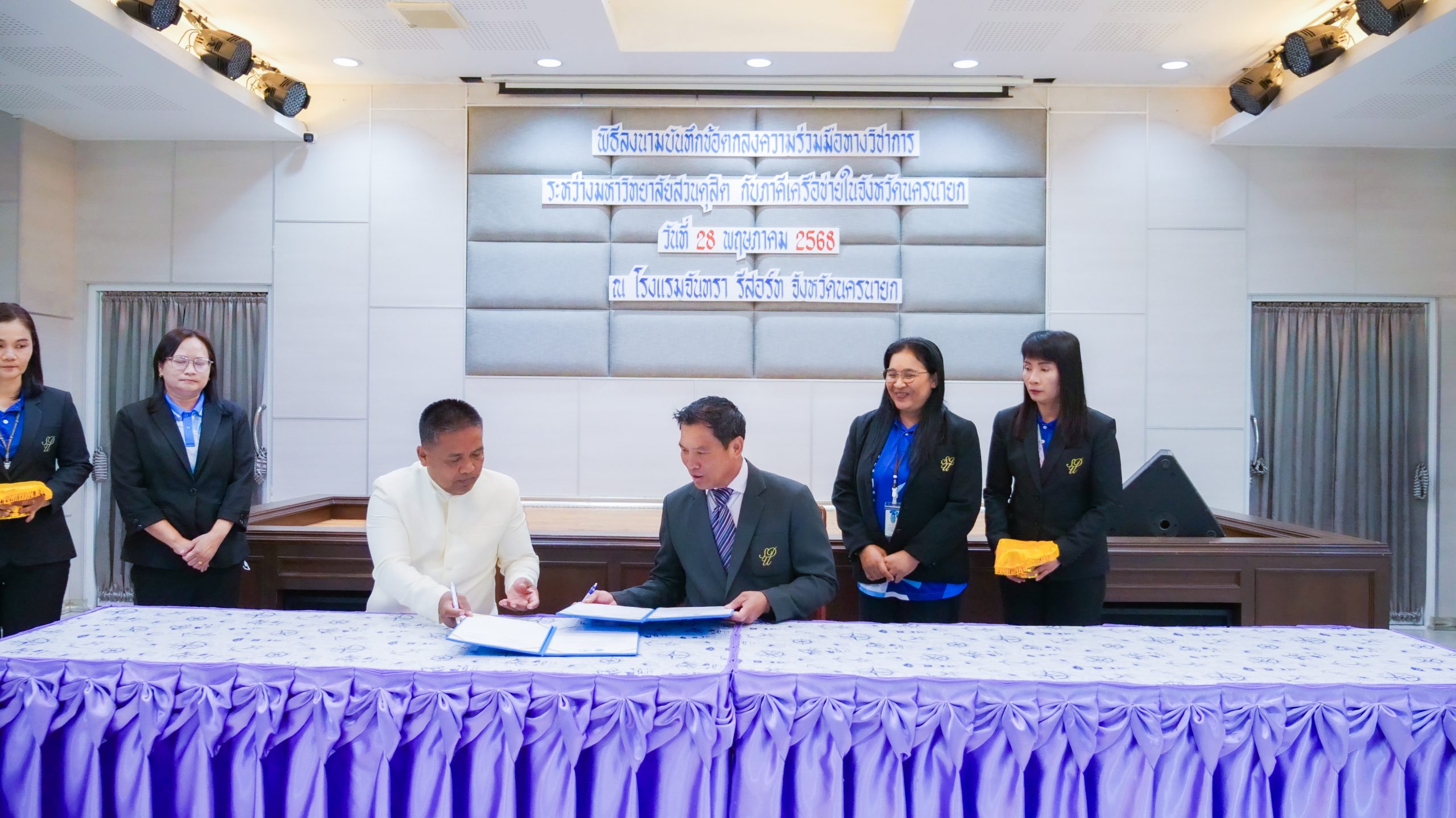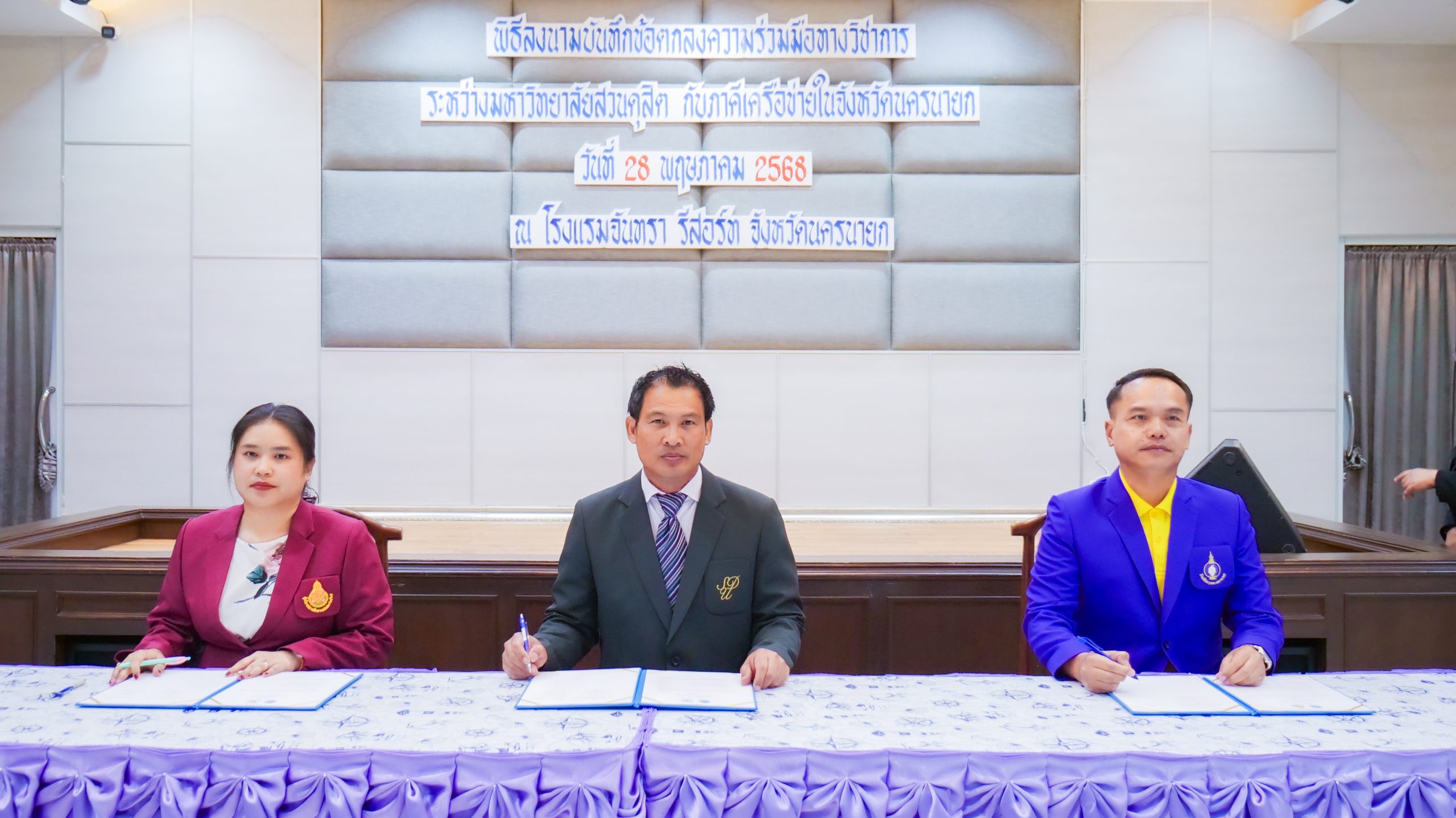 ในวันที่ 28 พฤษภาคม 2568 เวลา 09.00 – 12.00 น. มหาวิทยาลัยสวนดุสิต ศูนย์การศึกษานครนายก ได้ดำเนินการจัดทำบันทึกข้อตกลงความร่วมมือทางวิชาการ (Memorandom of Understanding : MOU) กับหน่วยงานภาคีเครือข่ายในจังหวัดนครนายก เพื่อสร้างความร่วมมือในการส่งเสริมสนับสนุนการศึกษาและร่วมมือในการส่งเสริมทางวิชาการ การพัฒนาการเรียนรู้อย่างมีคุณภาพที่หลากหลาย การวิจัย การฝึกอบรม การประชุมสัมมนา และการสนับสนุนให้ความร่วมมือทางสื่อการเรียนรู้และเทคโนโลยีที่เหมาะสม ณ ห้องราวินทรา โรงแรมจันทรารีสอร์ท จังหวัดนครนายก