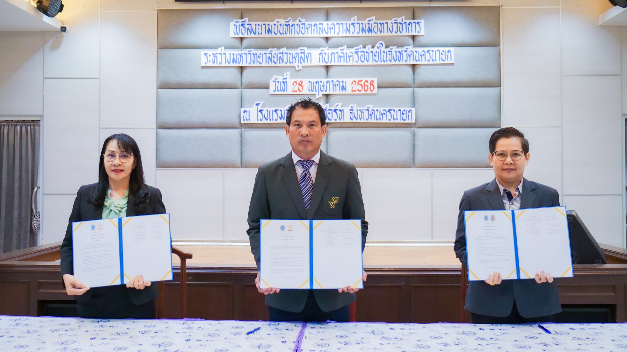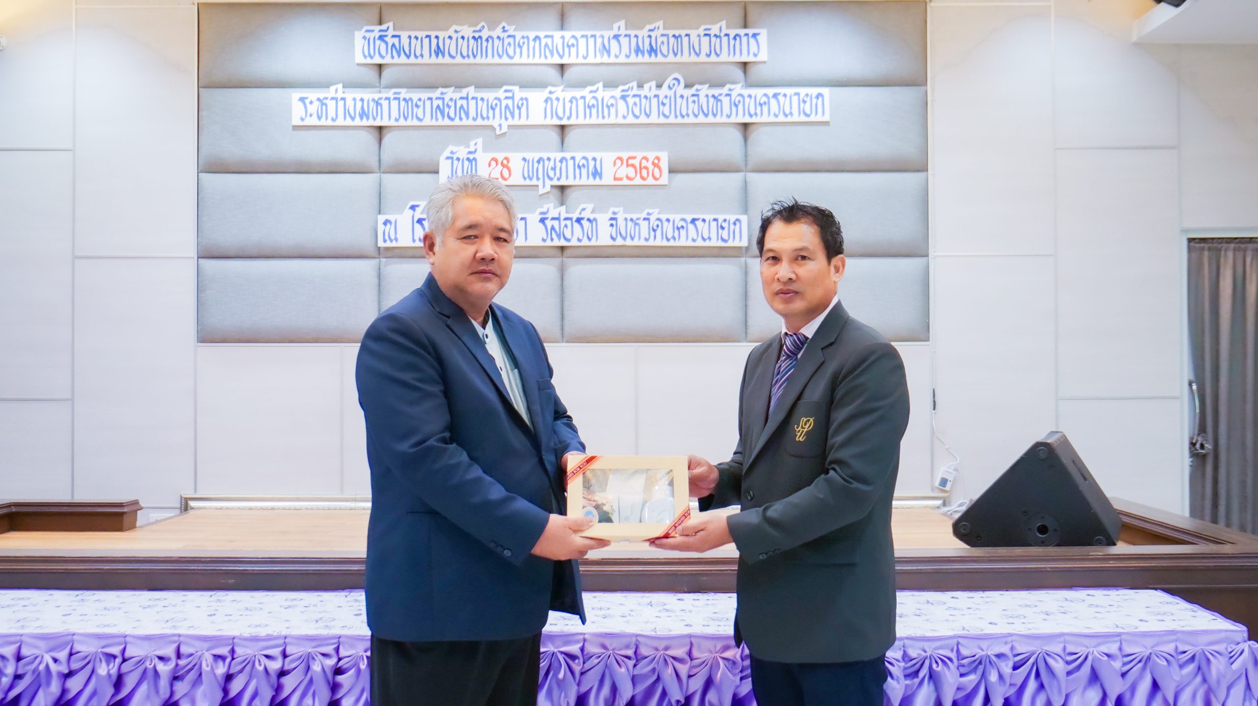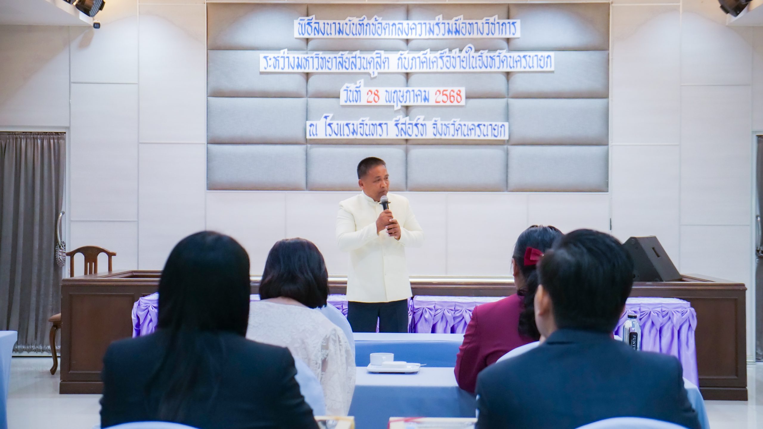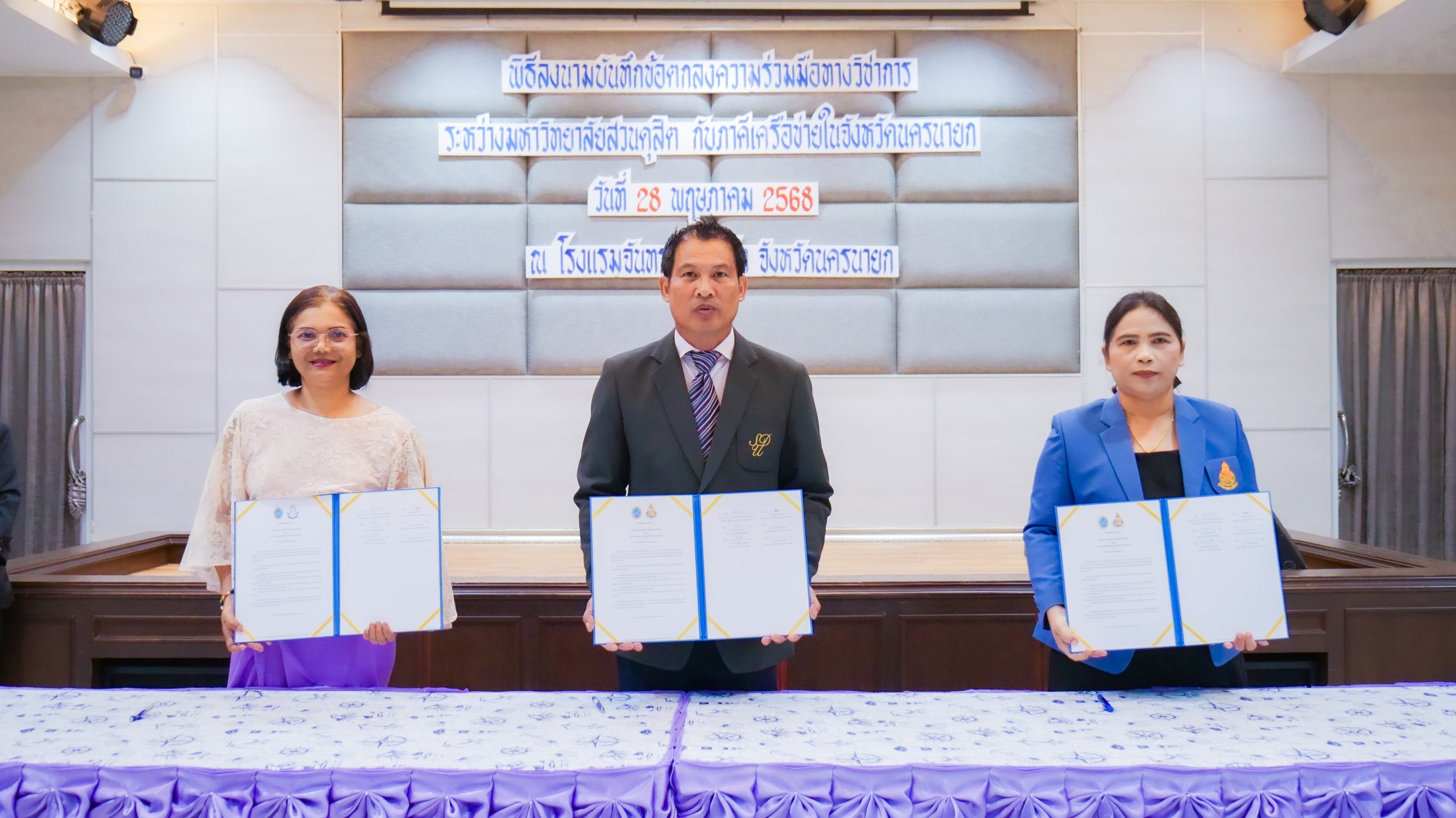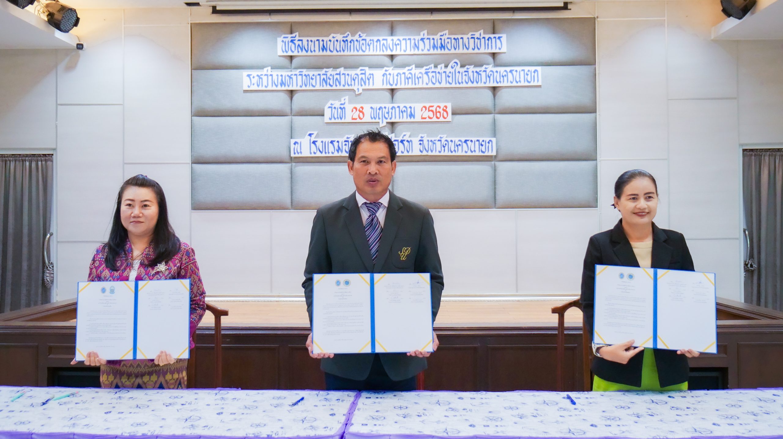 ในวันที่ 28 พฤษภาคม 2568 เวลา 09.00 – 12.00 น. มหาวิทยาลัยสวนดุสิต ศูนย์การศึกษานครนายก ได้ดำเนินการจัดทำบันทึกข้อตกลงความร่วมมือทางวิชาการ (Memorandom of Understanding : MOU) กับหน่วยงานภาคีเครือข่ายในจังหวัดนครนายก เพื่อสร้างความร่วมมือในการส่งเสริมสนับสนุนการศึกษาและร่วมมือในการส่งเสริมทางวิชาการ การพัฒนาการเรียนรู้อย่างมีคุณภาพที่หลากหลาย การวิจัย การฝึกอบรม การประชุมสัมมนา และการสนับสนุนให้ความร่วมมือทางสื่อการเรียนรู้และเทคโนโลยีที่เหมาะสม ณ ห้องราวินทรา โรงแรมจันทรารีสอร์ท จังหวัดนครนายก