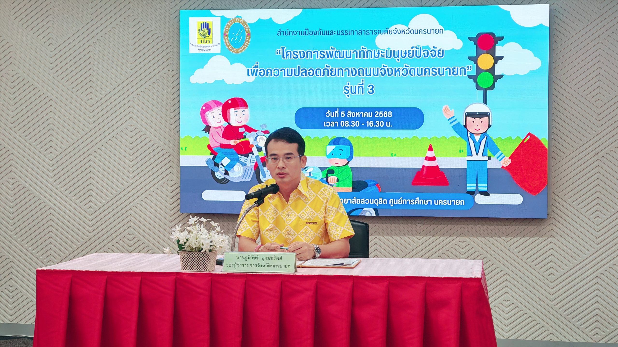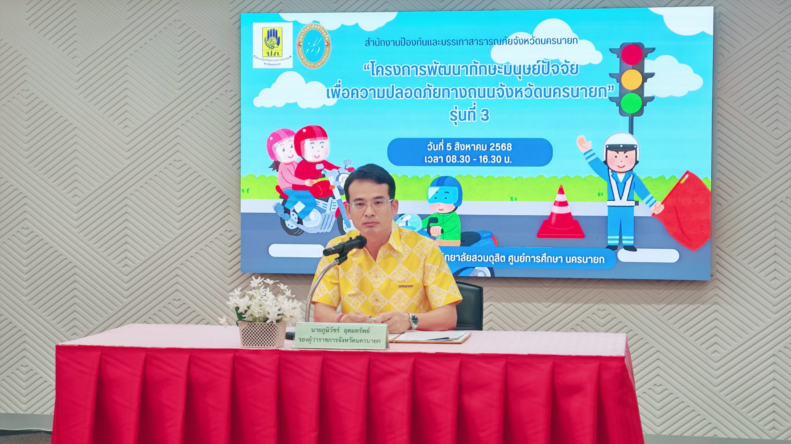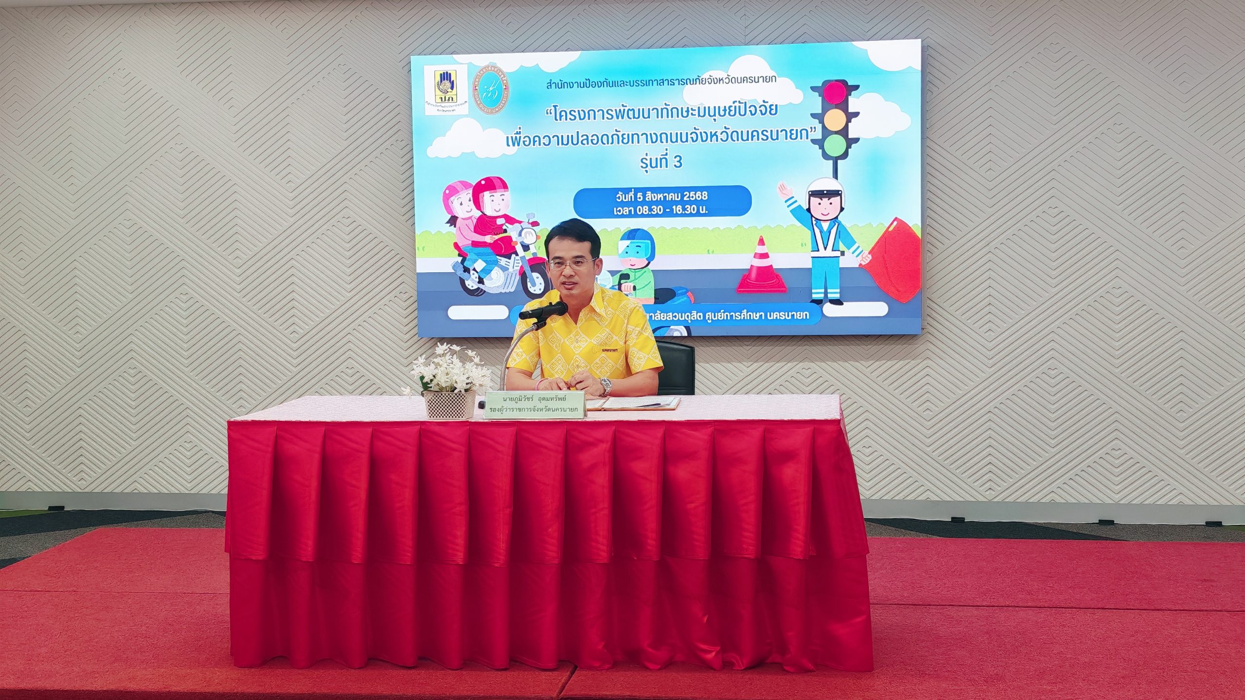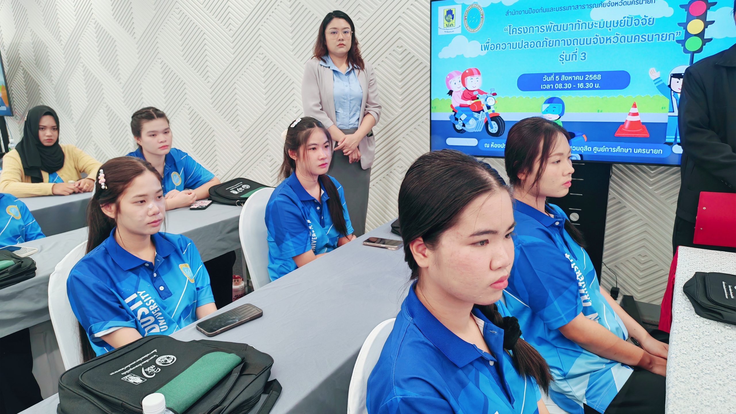 สำนักงานป้องกันและบรรเทาสาธารณภัยจังหวัดนครนายก จัดโครงการ “พัฒนาทักษะมนุษย์ปัจจัยเพื่อความปลอดภัยทางถนนจังหวัดนครนายก รุ่นที่ 3” โดยได้รับเกียรติจาก นายภูมิวัชร์ อุดมทรัพย์ รองผู้ว่าราชการจังหวัดนครนายก เป็นประธานเปิดโครงการ พร้อมด้วยนายคม ศรีเพ็ชร หัวหน้าสำนักงานป้องกันและบรรเทาสาธารณภัยจังหวัดนครนายก หัวหน้าส่วนราชการ และนาวาอากาศเอก สุวรรณ ภู่เต็ง ผู้เชี่ยวชาญด้านความปลอดภัยด้วยมนุษย์ปัจจัย เพื่อความปลอดภัยทางถนนและคณะ เป็นวิทยากรให้ความรู้แก่นักศึกษาชั้นปีที่ 1 – 3 สาขาวิชาการศึกษาปฐมวัย และสาขาวิชาการประถมศึกษา มหาวิทยาลัยสวนดุสิต ศูนย์การศึกษา นครนายก จำนวน 125 คน โดยมีเป้าหมายเพื่อส่งเสริมความรู้ ความเข้าใจ และทักษะที่จำเป็นในการสร้างความปลอดภัยบนท้องถนน มุ่งเน้นการมีส่วนร่วมของทุกภาคส่วนในการลดอุบัติเหตุและสร้างวัฒนธรรมความปลอดภัยในสังคมไทย ในวันที่ 5 สิงหาคม 2568 เวลา 08.30 -16.00 น. ณ ห้องประชุมเฟื่องฟ้า มหาวิทยาลัยสวนดุสิต ศูนย์การศึกษา นครนายก