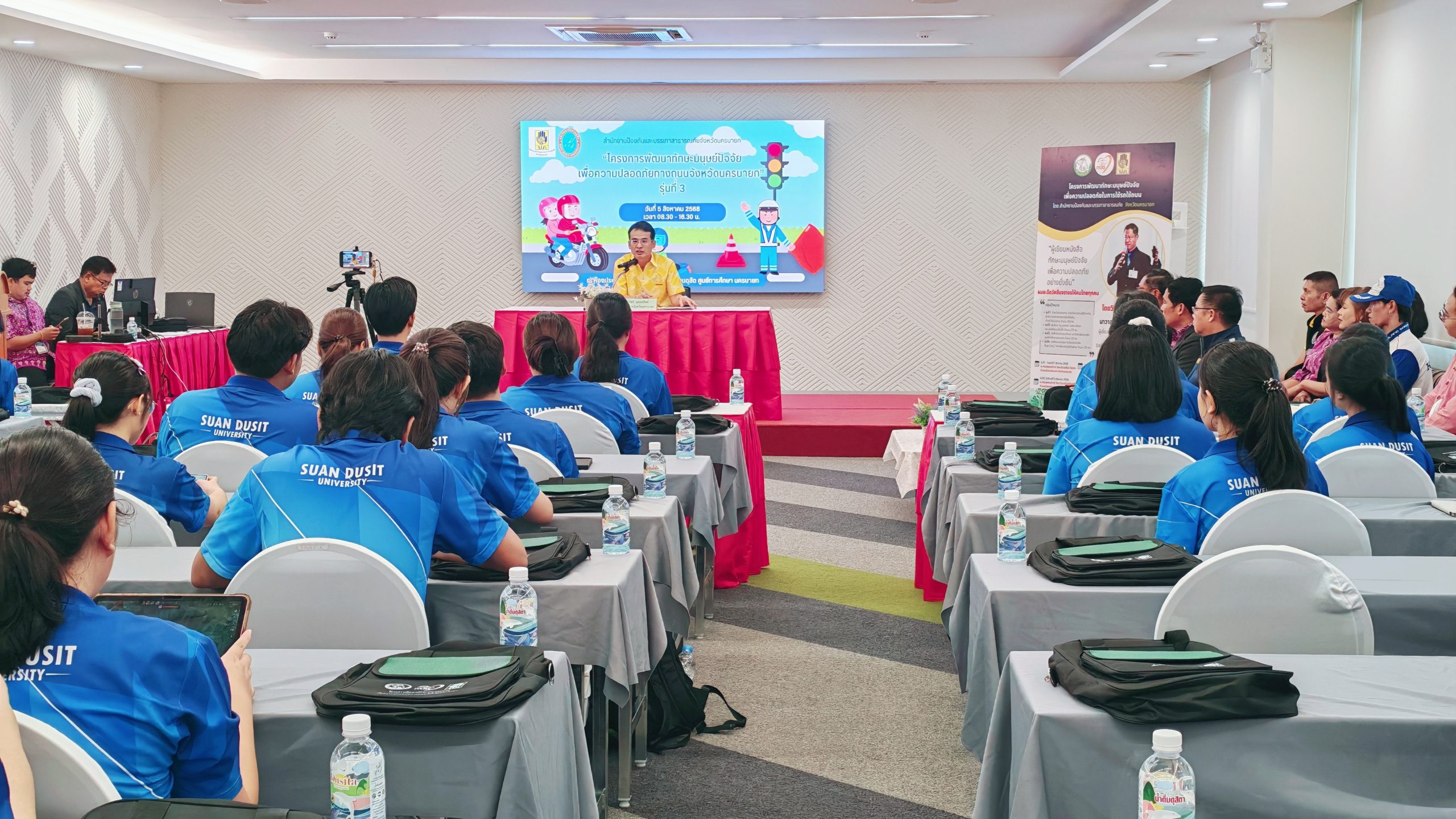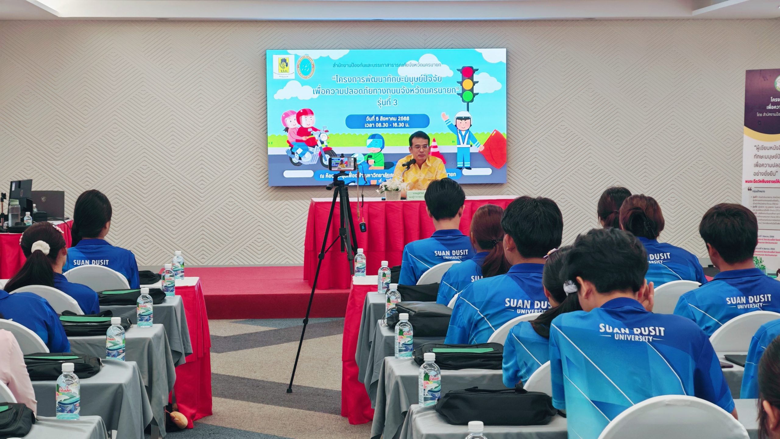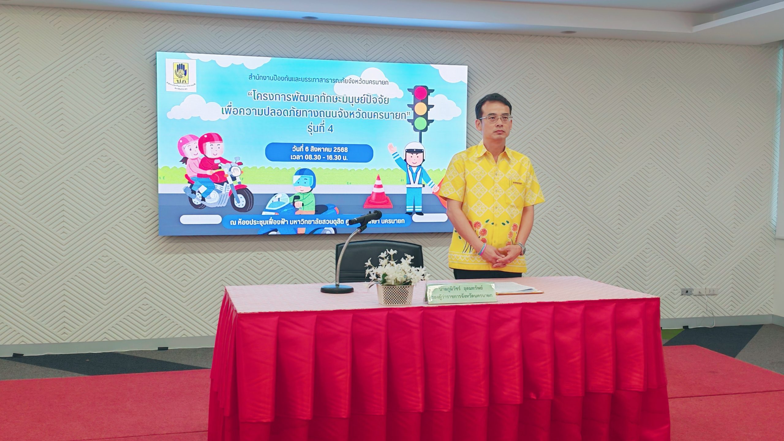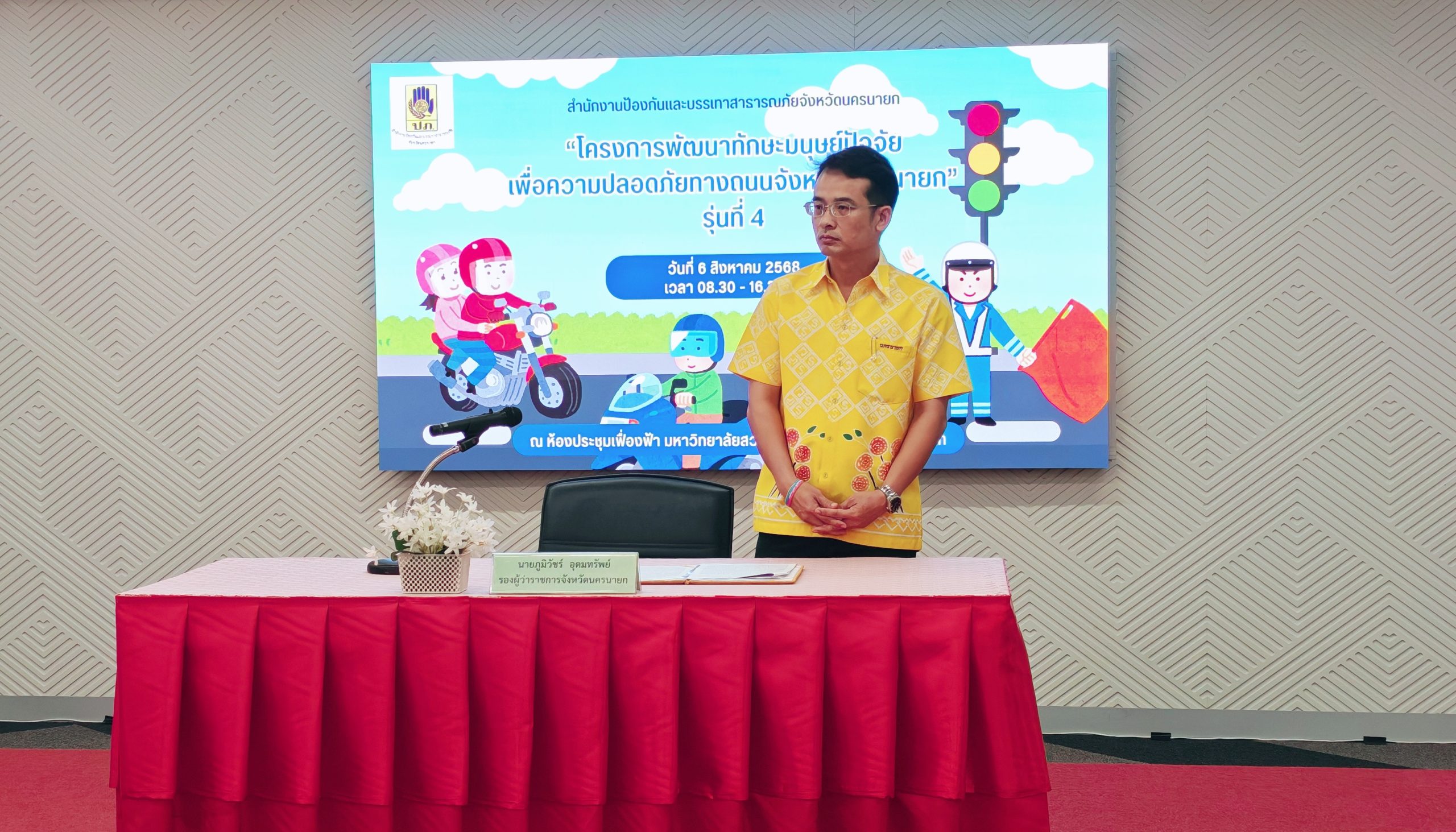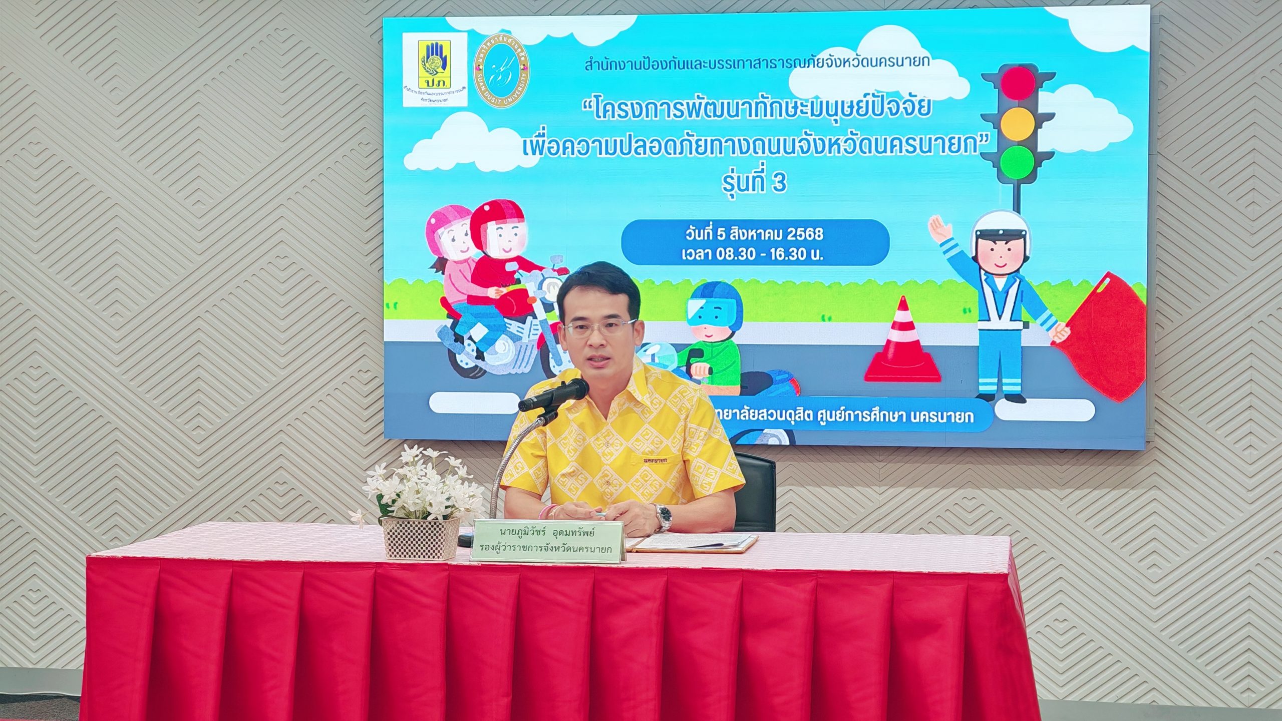 สำนักงานป้องกันและบรรเทาสาธารณภัยจังหวัดนครนายก จัดโครงการ “พัฒนาทักษะมนุษย์ปัจจัยเพื่อความปลอดภัยทางถนนจังหวัดนครนายก รุ่นที่ 3” โดยได้รับเกียรติจาก นายภูมิวัชร์ อุดมทรัพย์ รองผู้ว่าราชการจังหวัดนครนายก เป็นประธานเปิดโครงการ พร้อมด้วยนายคม ศรีเพ็ชร หัวหน้าสำนักงานป้องกันและบรรเทาสาธารณภัยจังหวัดนครนายก หัวหน้าส่วนราชการ และนาวาอากาศเอก สุวรรณ ภู่เต็ง ผู้เชี่ยวชาญด้านความปลอดภัยด้วยมนุษย์ปัจจัย เพื่อความปลอดภัยทางถนนและคณะ เป็นวิทยากรให้ความรู้แก่นักศึกษาชั้นปีที่ 1 – 3 สาขาวิชาการศึกษาปฐมวัย และสาขาวิชาการประถมศึกษา มหาวิทยาลัยสวนดุสิต ศูนย์การศึกษา นครนายก จำนวน 125 คน โดยมีเป้าหมายเพื่อส่งเสริมความรู้ ความเข้าใจ และทักษะที่จำเป็นในการสร้างความปลอดภัยบนท้องถนน มุ่งเน้นการมีส่วนร่วมของทุกภาคส่วนในการลดอุบัติเหตุและสร้างวัฒนธรรมความปลอดภัยในสังคมไทย ในวันที่ 5 สิงหาคม 2568 เวลา 08.30 -16.00 น. ณ ห้องประชุมเฟื่องฟ้า มหาวิทยาลัยสวนดุสิต ศูนย์การศึกษา นครนายก