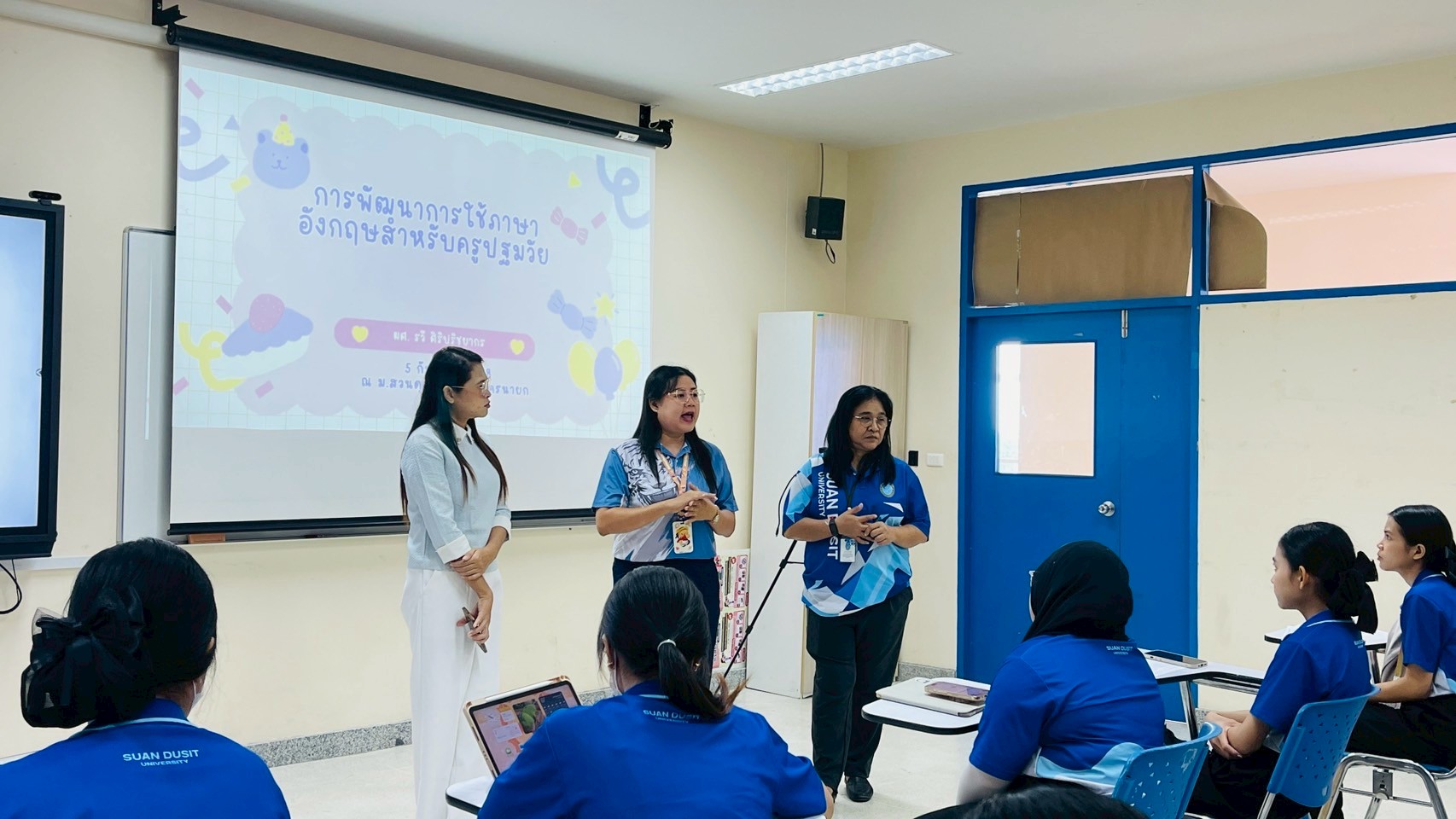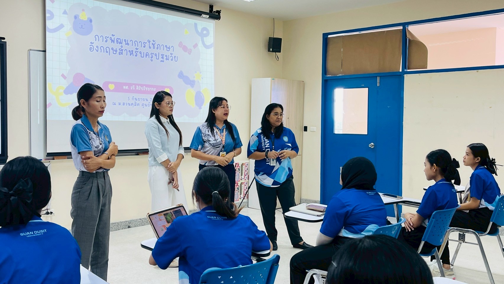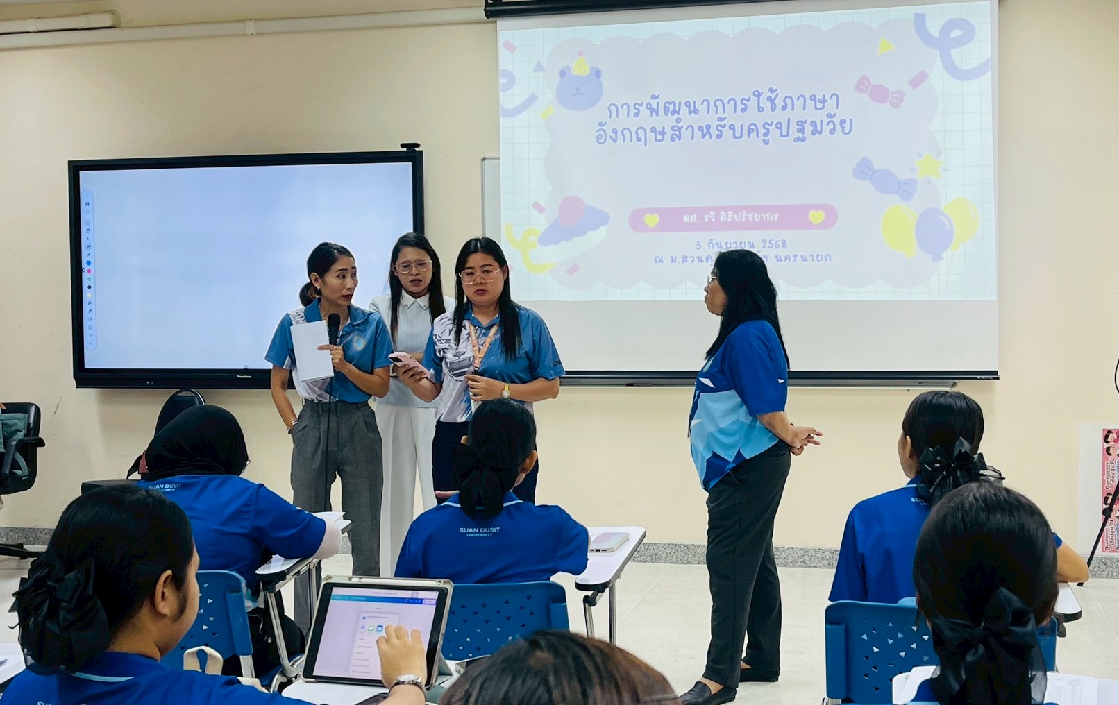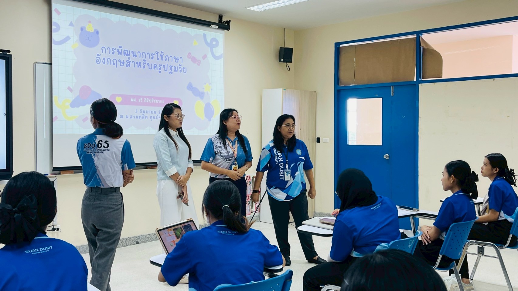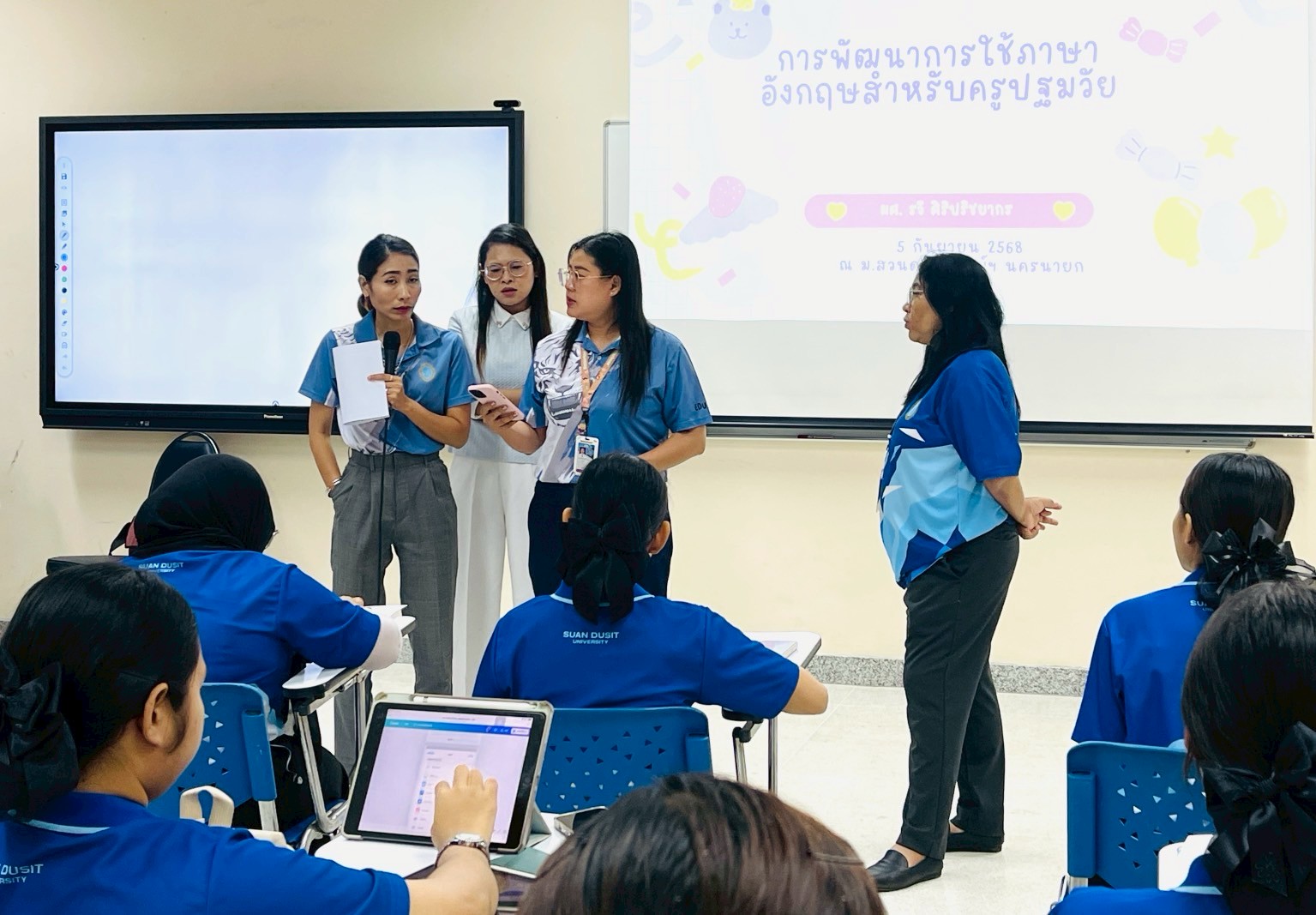 ในวันที่ 5 กันยายน 2568 เวลา 08.30 – 16.00 น. หลักสูตรศึกษาศาสตรบัณฑิต สาขาวิชาการศึกษาปฐมวัย มหาวิทยาลัยสวนดุสิต ศูนย์การศึกษา นครนายก จัดโครงการพัฒนาสมรรถนะนักศึกษาสาขาวิชาการศึกษาปฐมวัย สู่ความเป็นเลิศในศตวรรษที่ 21 กิจกรรมที่ 3 เทคนิคการใช้ภาษาอังกฤษในการจัดประสบการณ์ในห้องเรียน ภาคเรียนที่ 1 ปีการศึกษา 2568 โดยได้รับเกียรติจาก อาจารย์ปรตา หวังดุล อาจารย์ประจำวิทยาลัยการฝึกหัดครู มหาวิทยาลัยราชภัฏพระนคร และ ผศ.รวี ศิริปริชยากร เป็นวิทยากรผู้ให้ความรู้ กิจกรรมนี้มีวัตถุประสงค์เพื่อส่งเสริมนักศึกษาให้มีคุณลักษณะมาตรฐานการเรียนรู้ตามกรอบมาตรฐานคุณวุฒิ (TQF : HEd) และเพื่อการพัฒนานักศึกษาให้มีสมรรถนะและทักษะการเรียนรู้ในศตวรรษที่ 21 ณ ห้องเรียน 553 มหาวิทยาลัยสวนดุสิต ศูนย์การศึกษา นครนายก