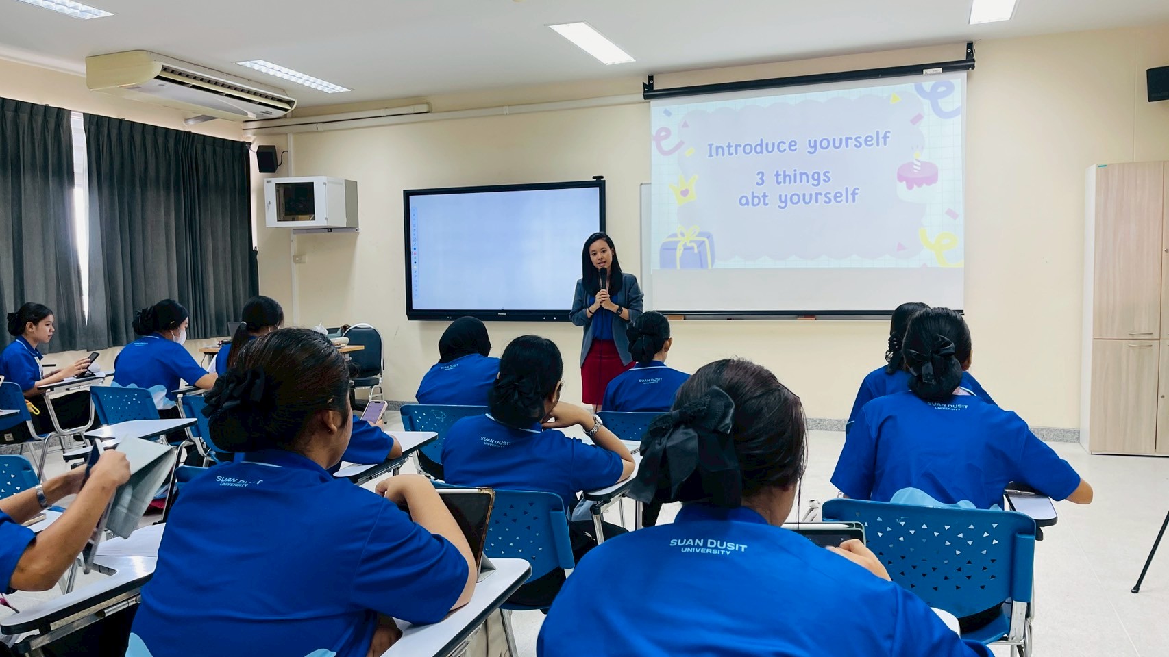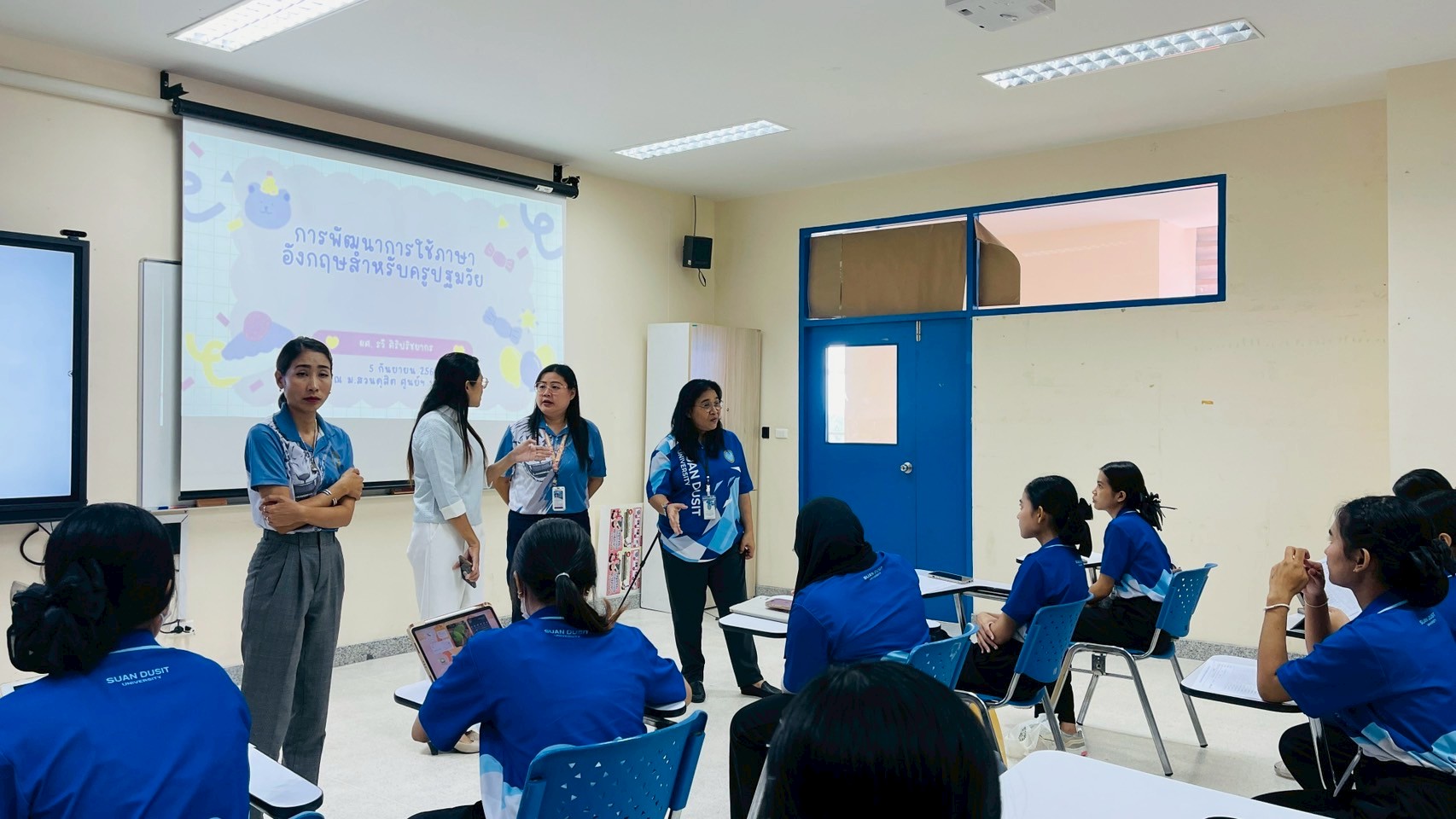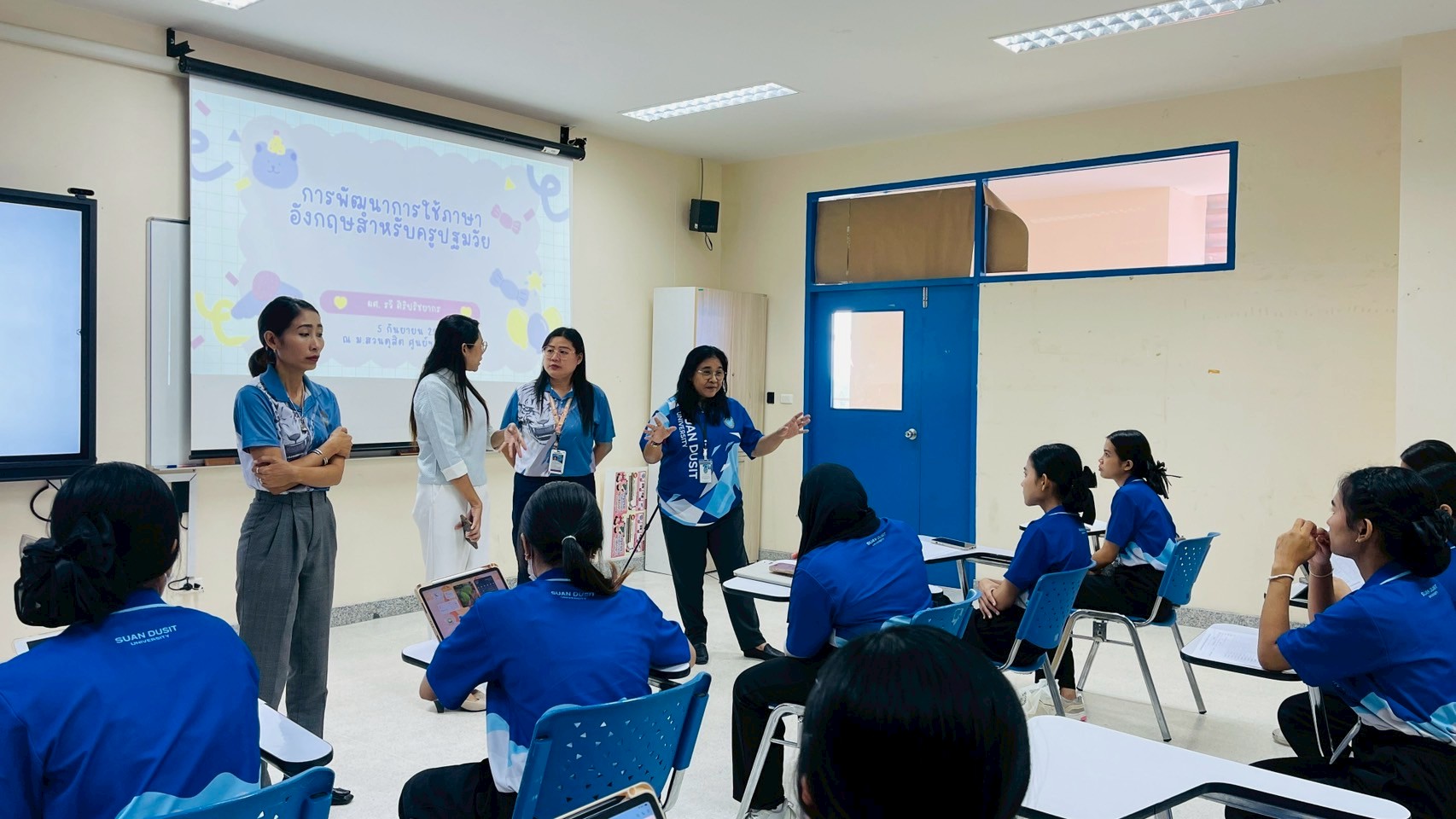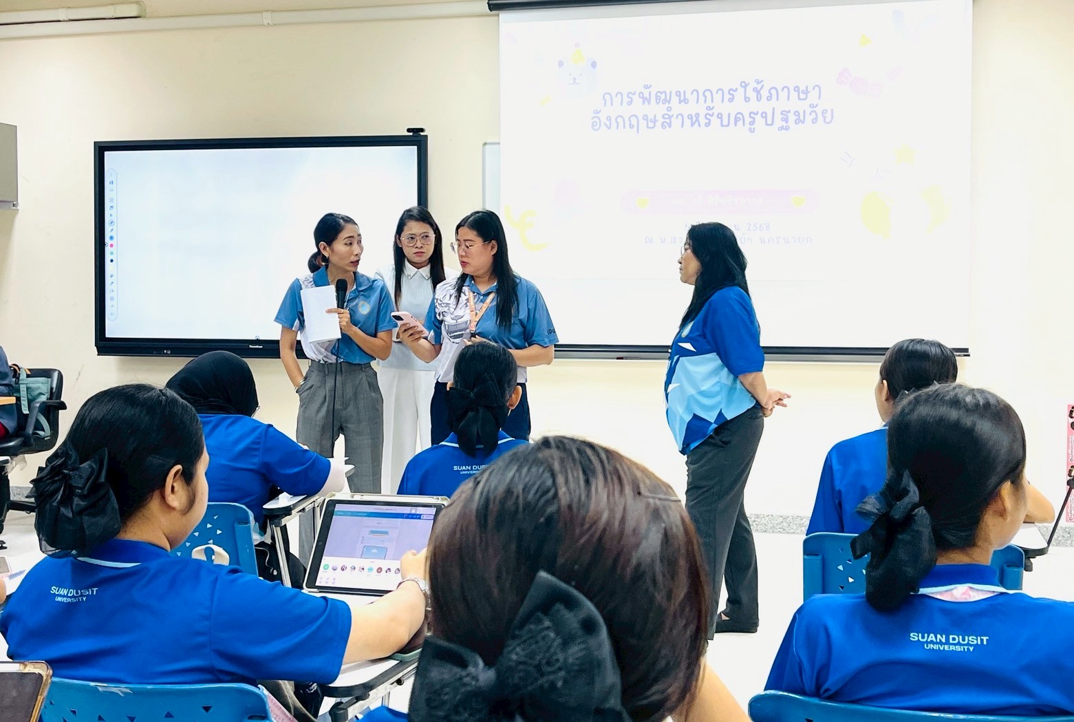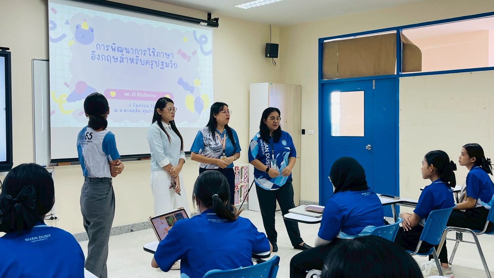 ในวันที่ 5 กันยายน 2568 เวลา 08.30 – 16.00 น. หลักสูตรศึกษาศาสตรบัณฑิต สาขาวิชาการศึกษาปฐมวัย มหาวิทยาลัยสวนดุสิต ศูนย์การศึกษา นครนายก จัดโครงการพัฒนาสมรรถนะนักศึกษาสาขาวิชาการศึกษาปฐมวัย สู่ความเป็นเลิศในศตวรรษที่ 21 กิจกรรมที่ 3 เทคนิคการใช้ภาษาอังกฤษในการจัดประสบการณ์ในห้องเรียน ภาคเรียนที่ 1 ปีการศึกษา 2568 โดยได้รับเกียรติจาก อาจารย์ปรตา หวังดุล อาจารย์ประจำวิทยาลัยการฝึกหัดครู มหาวิทยาลัยราชภัฏพระนคร และ ผศ.รวี ศิริปริชยากร เป็นวิทยากรผู้ให้ความรู้ กิจกรรมนี้มีวัตถุประสงค์เพื่อส่งเสริมนักศึกษาให้มีคุณลักษณะมาตรฐานการเรียนรู้ตามกรอบมาตรฐานคุณวุฒิ (TQF : HEd) และเพื่อการพัฒนานักศึกษาให้มีสมรรถนะและทักษะการเรียนรู้ในศตวรรษที่ 21 ณ ห้องเรียน 553 มหาวิทยาลัยสวนดุสิต ศูนย์การศึกษา นครนายก