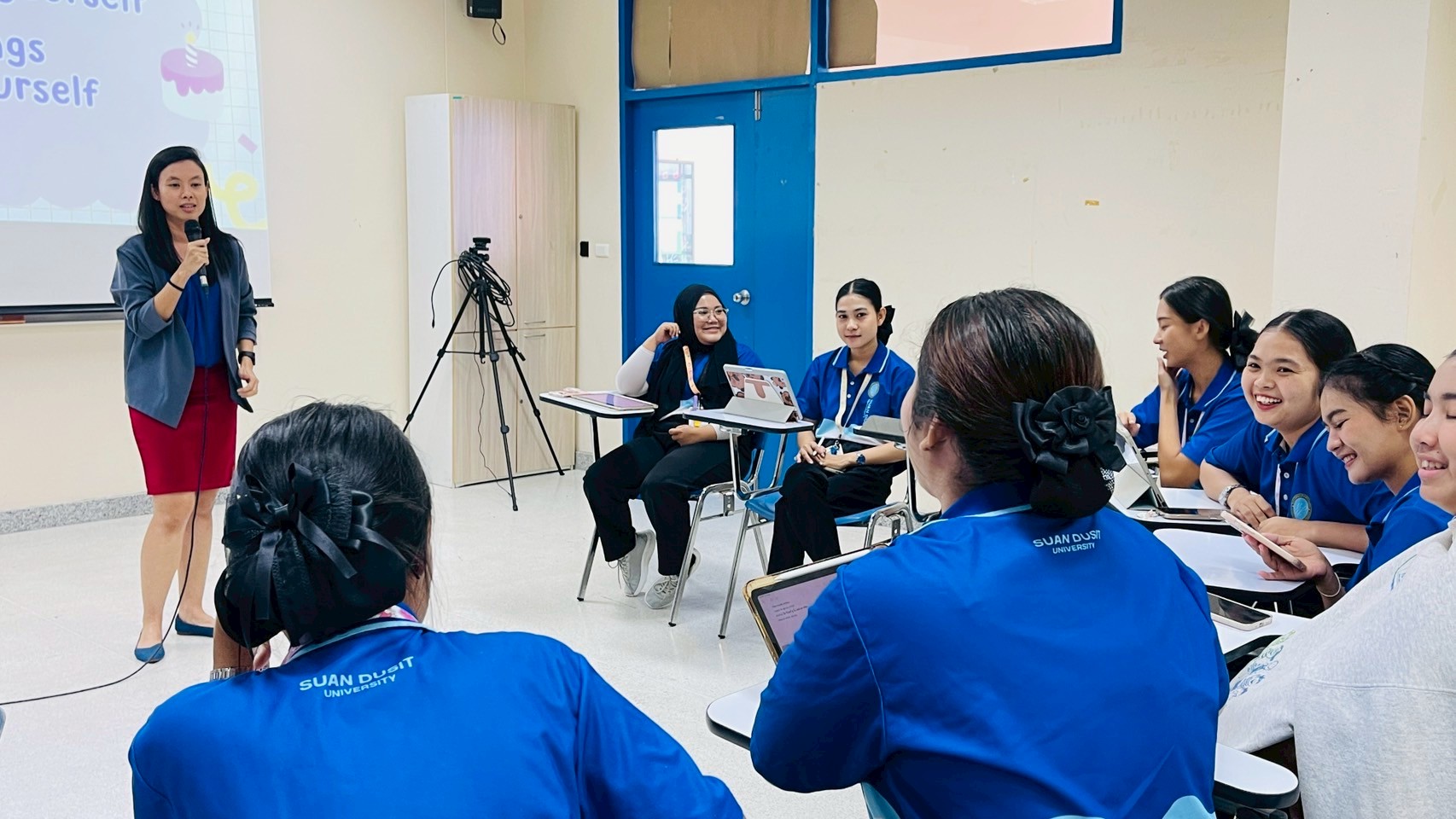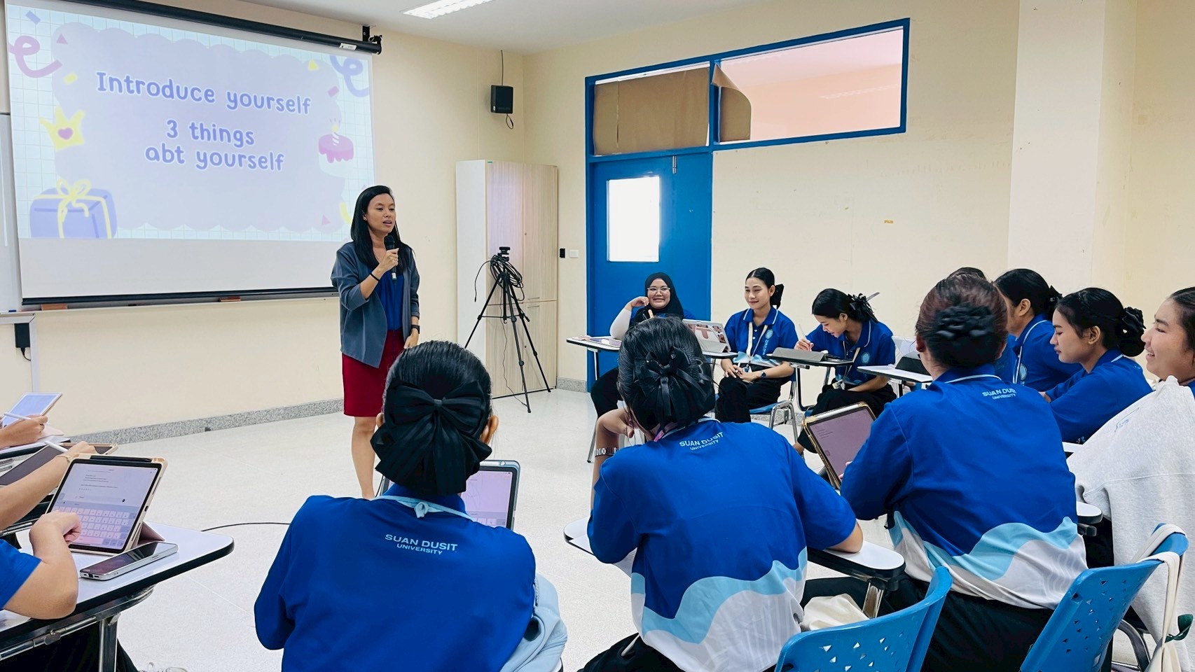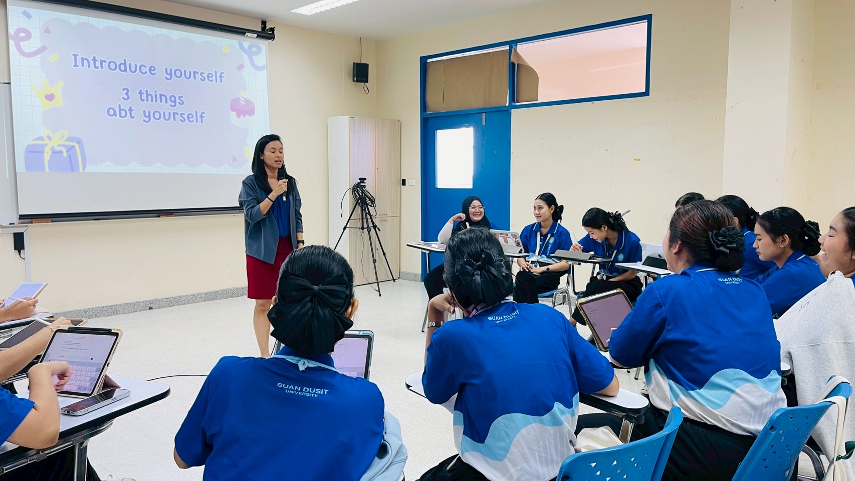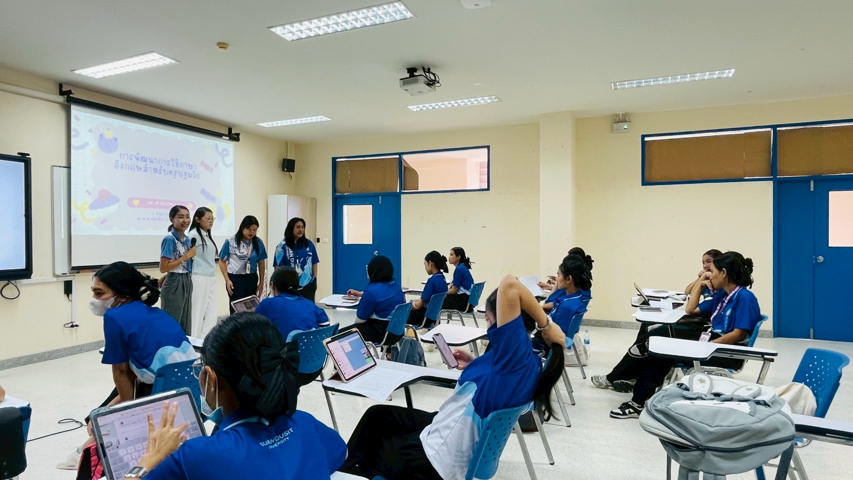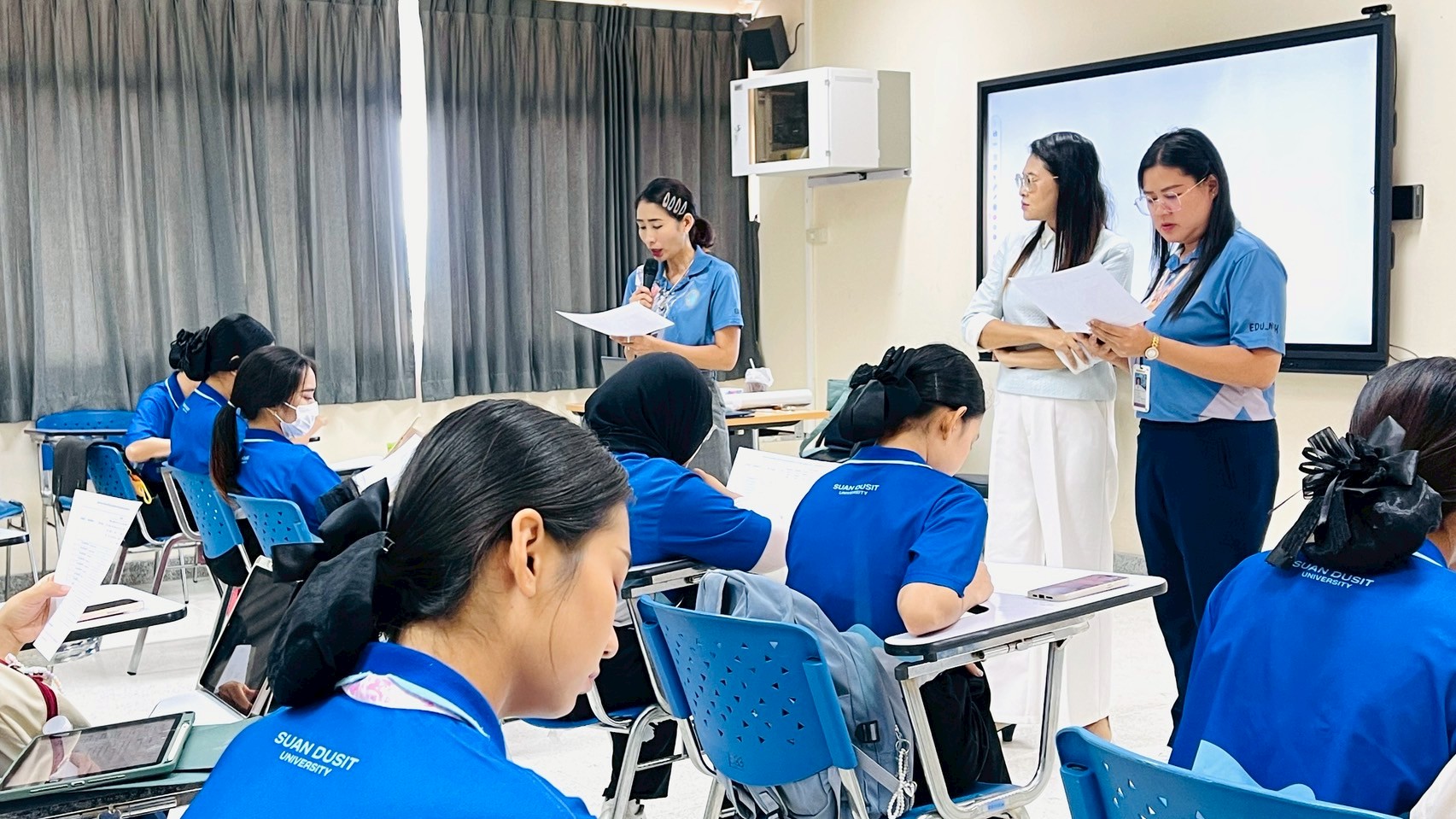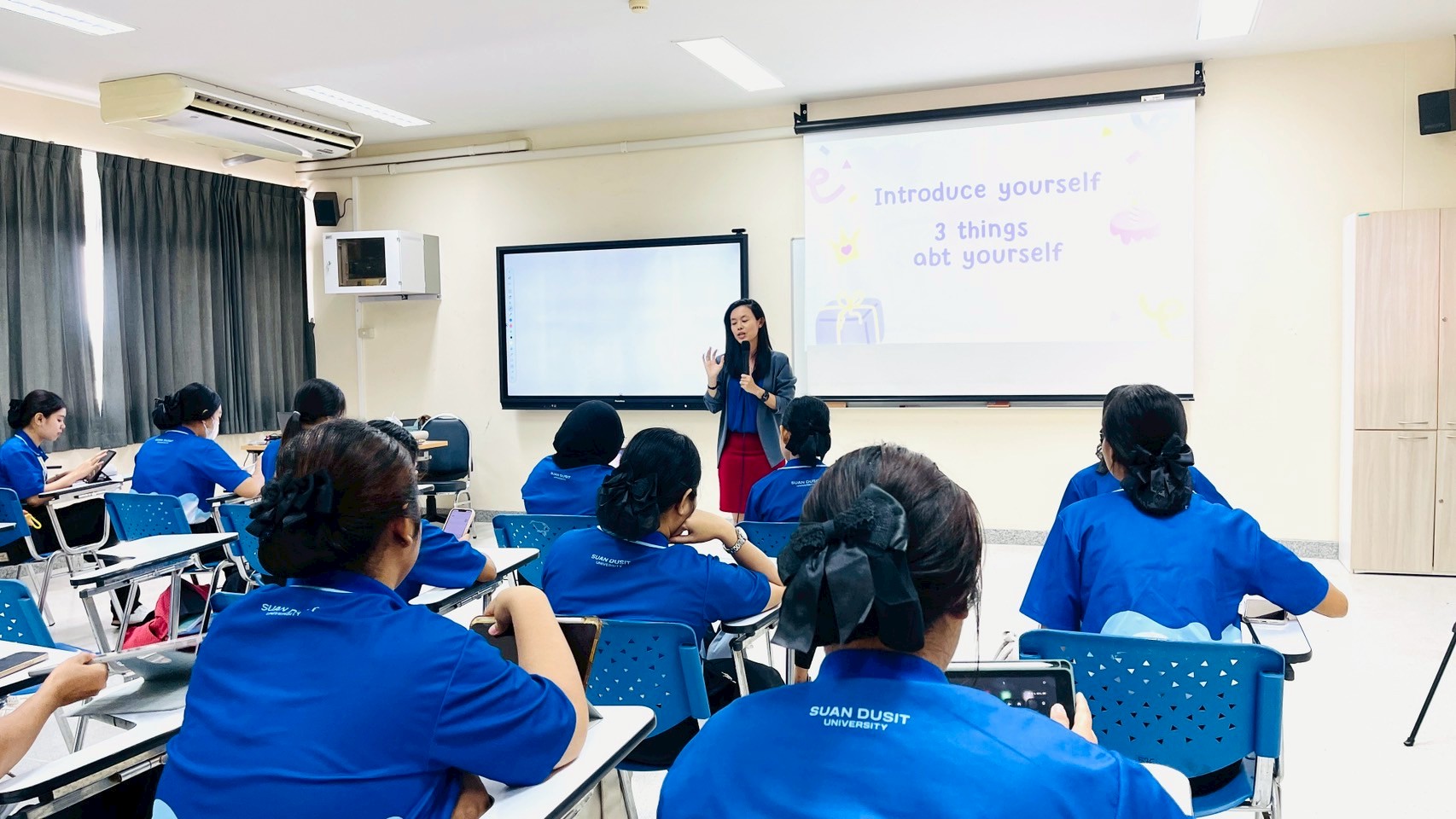 ในวันที่ 5 กันยายน 2568 เวลา 08.30 – 16.00 น. หลักสูตรศึกษาศาสตรบัณฑิต สาขาวิชาการศึกษาปฐมวัย มหาวิทยาลัยสวนดุสิต ศูนย์การศึกษา นครนายก จัดโครงการพัฒนาสมรรถนะนักศึกษาสาขาวิชาการศึกษาปฐมวัย สู่ความเป็นเลิศในศตวรรษที่ 21 กิจกรรมที่ 3 เทคนิคการใช้ภาษาอังกฤษในการจัดประสบการณ์ในห้องเรียน ภาคเรียนที่ 1 ปีการศึกษา 2568 โดยได้รับเกียรติจาก อาจารย์ปรตา หวังดุล อาจารย์ประจำวิทยาลัยการฝึกหัดครู มหาวิทยาลัยราชภัฏพระนคร และ ผศ.รวี ศิริปริชยากร เป็นวิทยากรผู้ให้ความรู้ กิจกรรมนี้มีวัตถุประสงค์เพื่อส่งเสริมนักศึกษาให้มีคุณลักษณะมาตรฐานการเรียนรู้ตามกรอบมาตรฐานคุณวุฒิ (TQF : HEd) และเพื่อการพัฒนานักศึกษาให้มีสมรรถนะและทักษะการเรียนรู้ในศตวรรษที่ 21 ณ ห้องเรียน 553 มหาวิทยาลัยสวนดุสิต ศูนย์การศึกษา นครนายก