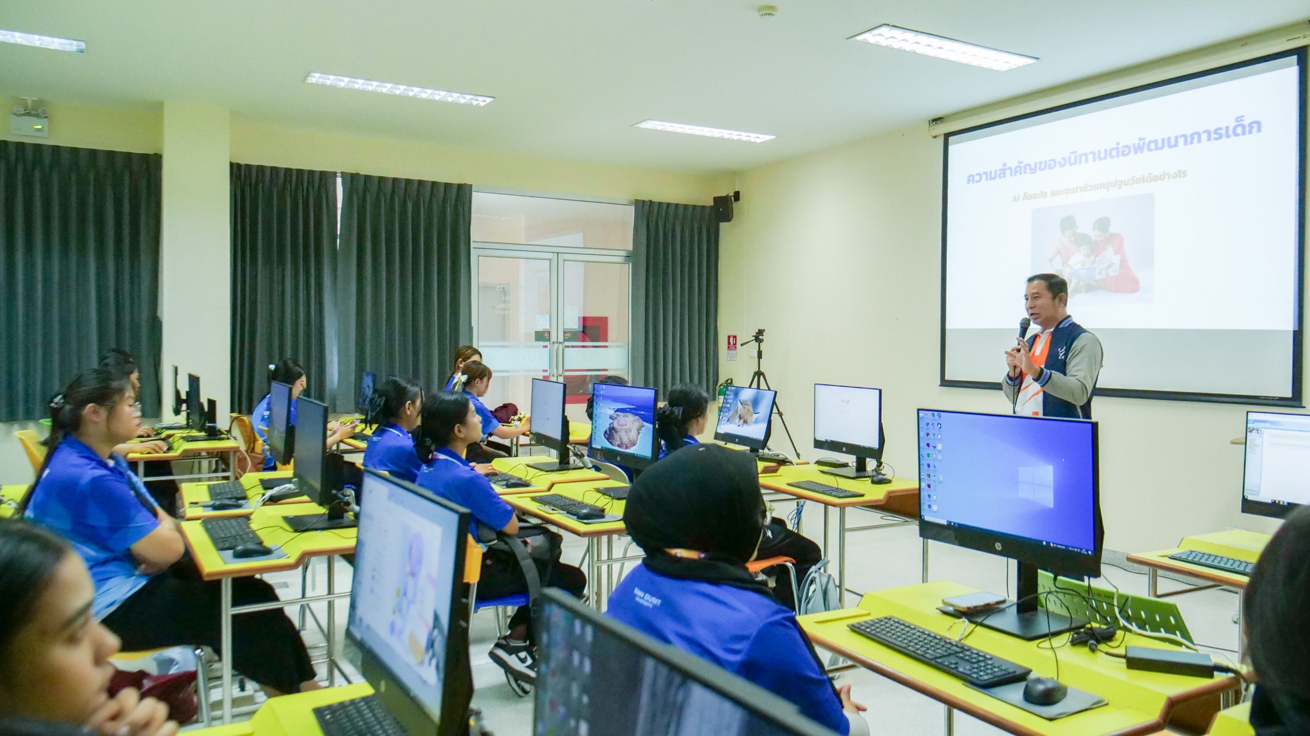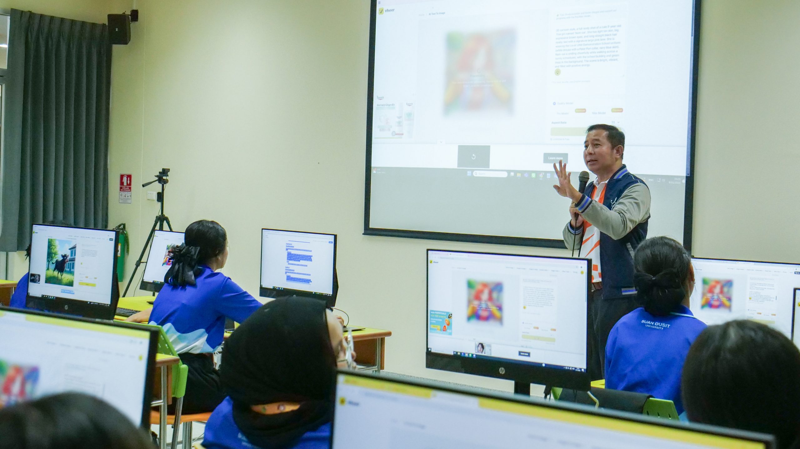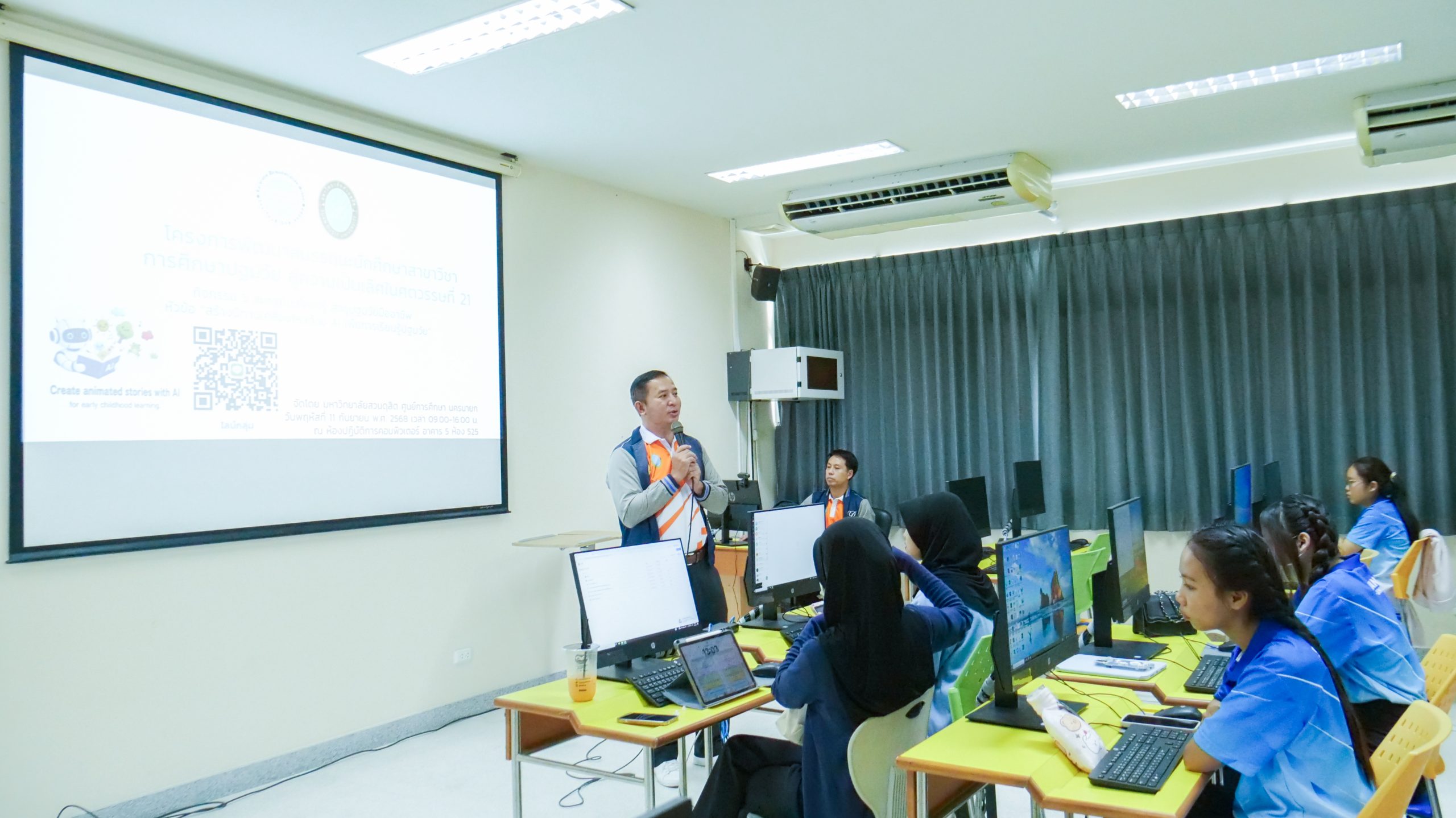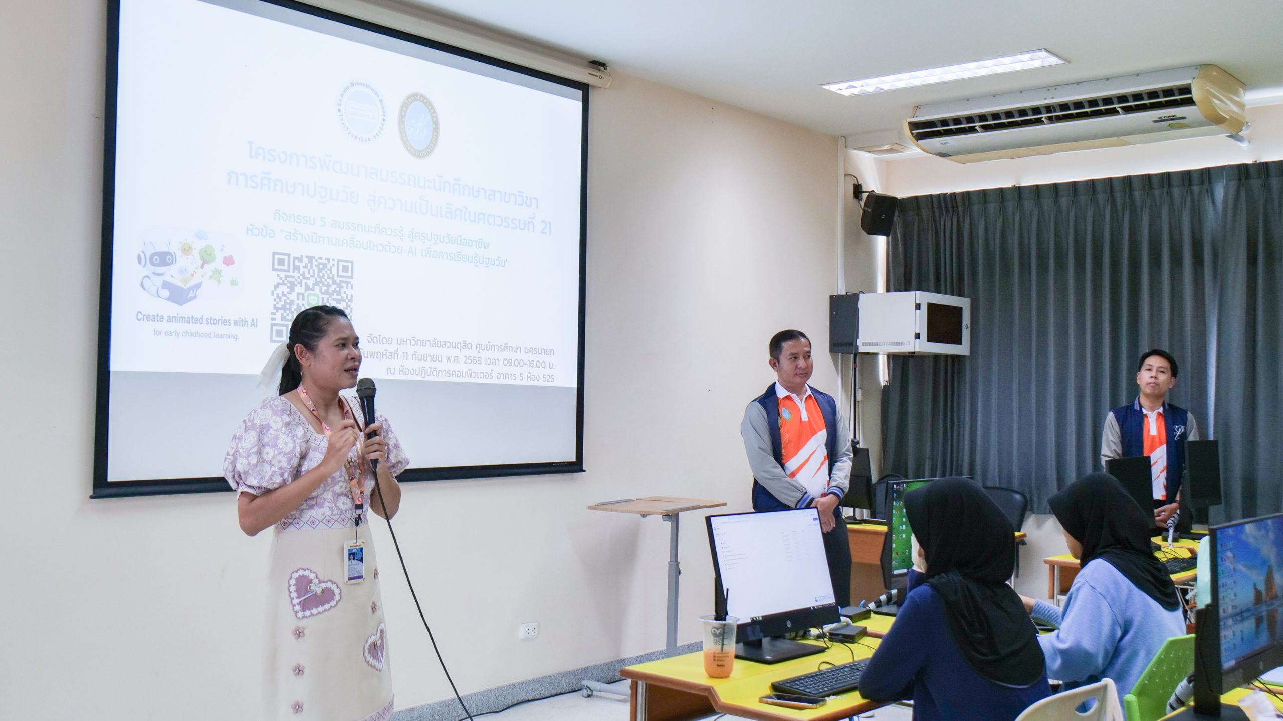 ในวันที่ 11 กันยายน 2568 เวลา 08.30 – 16.00 น. มหาวิทยาลัยสวนดุสิต ศูนย์การศึกษา นครนายก หลักสูตรศึกษาศาสตรบัณฑิต สาขาวิชาการศึกษาปฐมวัย จัดโครงการพัฒนาสมรรถนะนักศึกษา สาขาวิชาการศึกษาปฐมวัยสู่ความเป็นเลิศในศตวรรษที่ 21 ในกิจกรรมสมรรถนะที่ควรรู้ สู่ครูปฐมวัยมืออาชีพ ในหัวข้อ ” สร้างนิทานเคลื่อนไหวด้วย AI เพื่อการเรียนรู้ปฐมวัย” โดยได้รับเกียรติจากผู้ช่วยศาสตราจารย์จุฑาวุฒิ จันทรมาลี และคณะ เป็นวิทยากรให้ความรู้นักศึกษาหลักสูตรศึกษาศาสตรบัณฑิต สาขาวิชาการศึกษาปฐมวัย ชั้นปีที่ 1 – 4 ณ ห้องปฏิบัติการคอมพิวเตอร์ มหาวิทยาลัยสวนดุสิต ศูนย์การศึกษา นครนายก